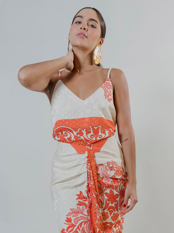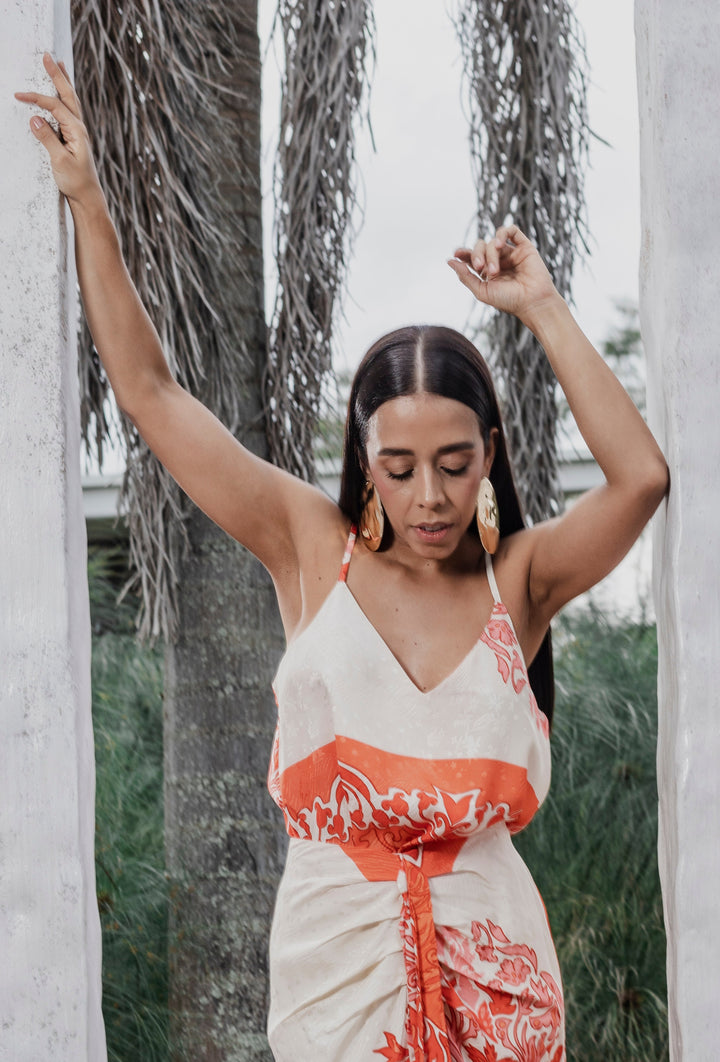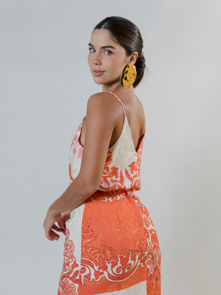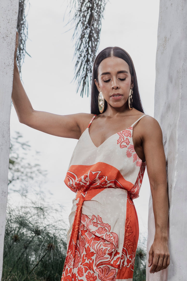 El diseño destaca por su estampado artístico en tonos coral y marfil, ideal para combinar con piezas lisas o en conjunto con la falda a juego de esta colección.