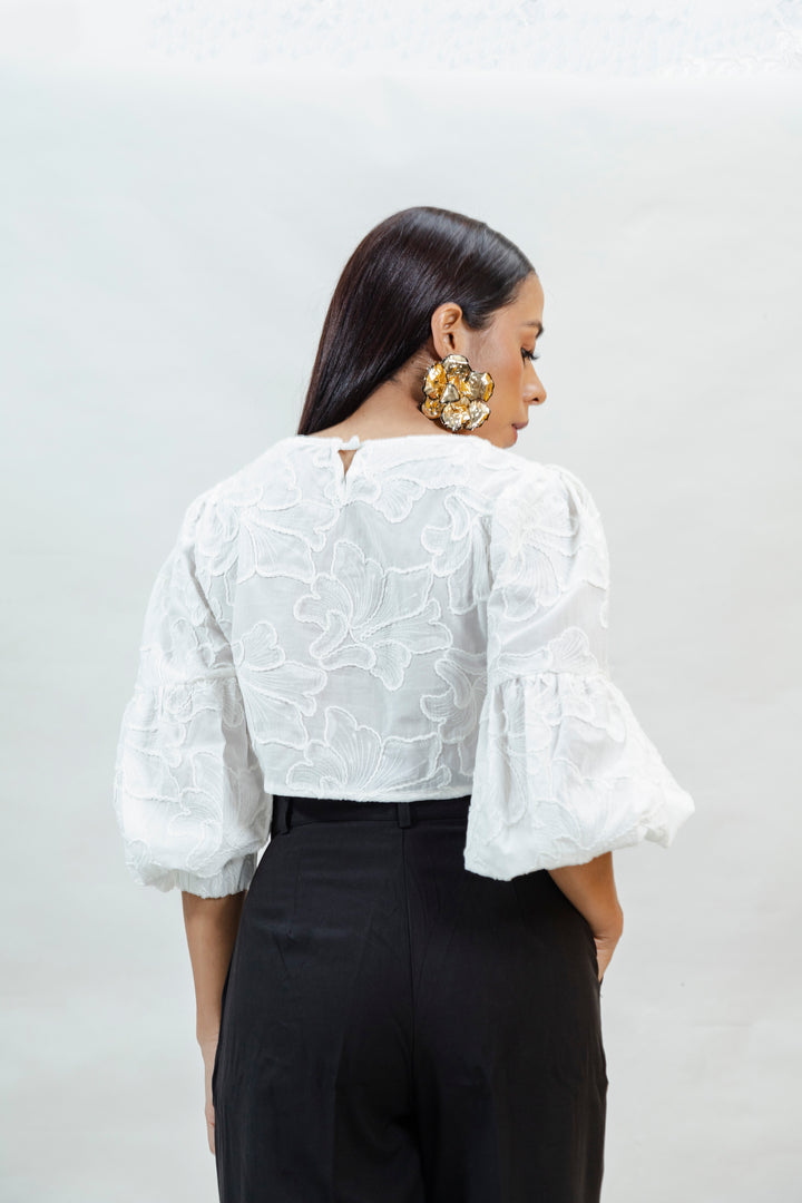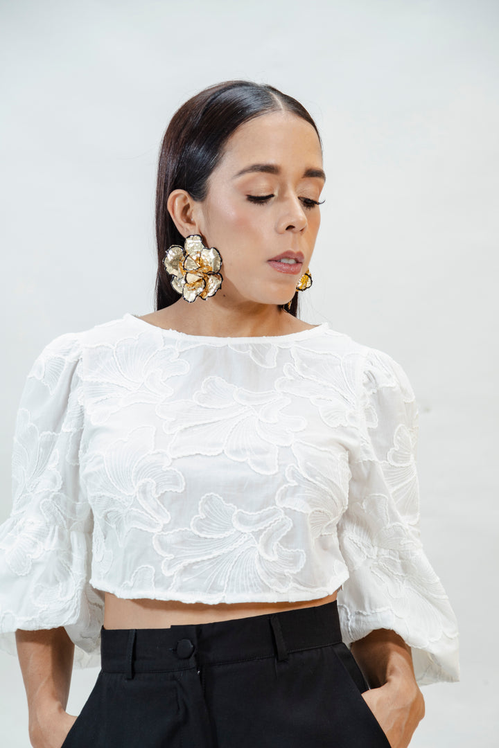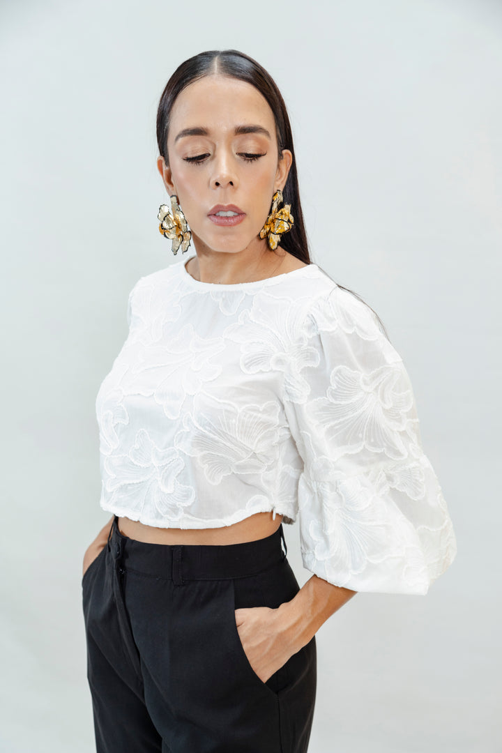 Una prenda delicada, fresca y sofisticada. Esta blusa crop está confeccionada en 100% algodón, lo que le brinda un tacto suave, gran transpirabilidad y un look natural. Su diseño destaca por el bordado en relieve de inspiración floral, que aporta textura y un acabado artesanal. Las mangas 3/4 tipo globo añaden volumen y feminidad, ideal para un look romántico y moderno.