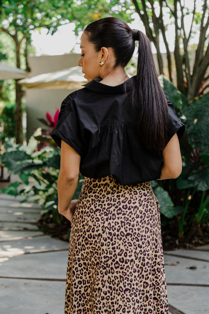 Confeccionada en algodón de tacto suave y con un ligero toque de spandex que aporta comodidad y libertad de movimiento. Su diseño cuenta con cuello tipo camisero, botones frontales y ajuste con cordón en la cintura, que realza la silueta con un estilo moderno y versátil. Ideal para combinar con faldas o pantalones de tiro alto.