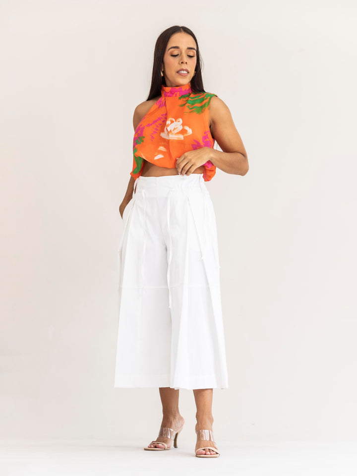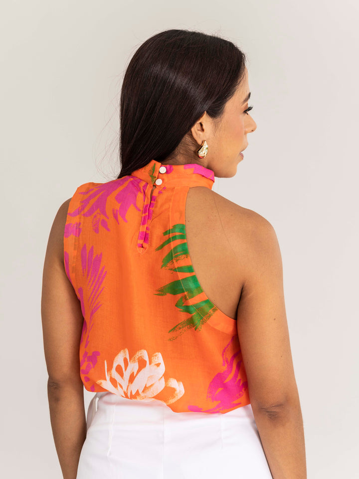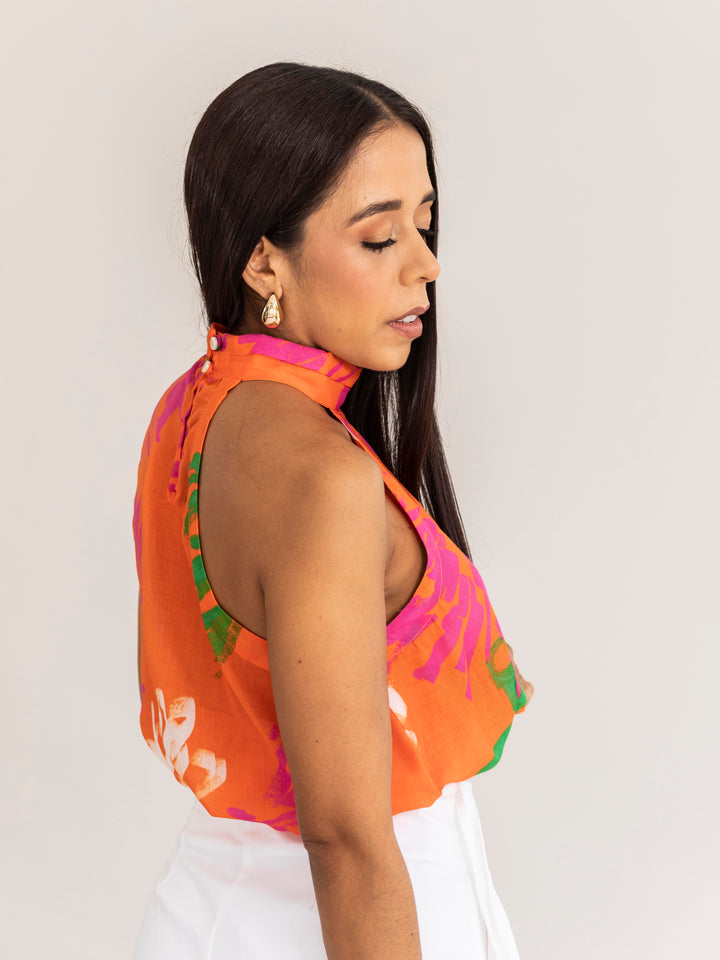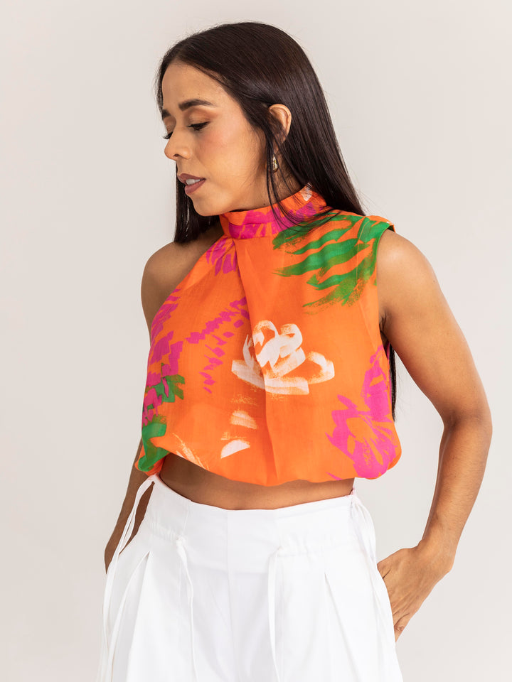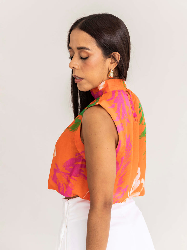 Su diseño de cuello alto con caída fluida y silueta crop aporta un toque moderno y sofisticado. El estampado vibrante en tonos naranjas, fucsias y verdes ilumina cualquier look, convirtiéndola en una pieza protagonista que resalta con personalidad.