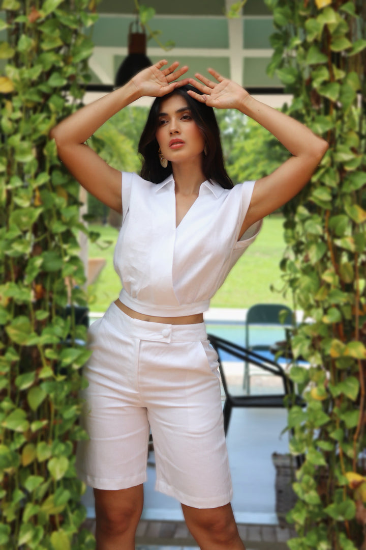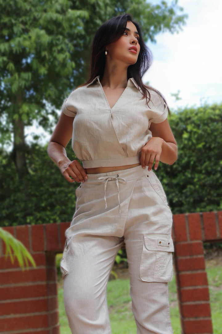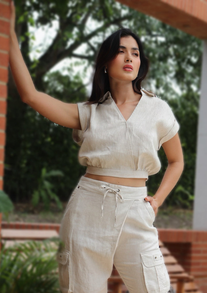 Blusa cropped de lino, con diseño cruzado al frente que aporta un toque elegante y moderno. Presenta cuello camisero clásico, mangas cortas tipo casquillo y un ajuste a la cintura que resalta la silueta. La parte trasera cuenta con un detalle de resorte que proporciona mayor comodidad y un ajuste perfecto. Una pieza versátil, ideal para un look fresco y sofisticado.