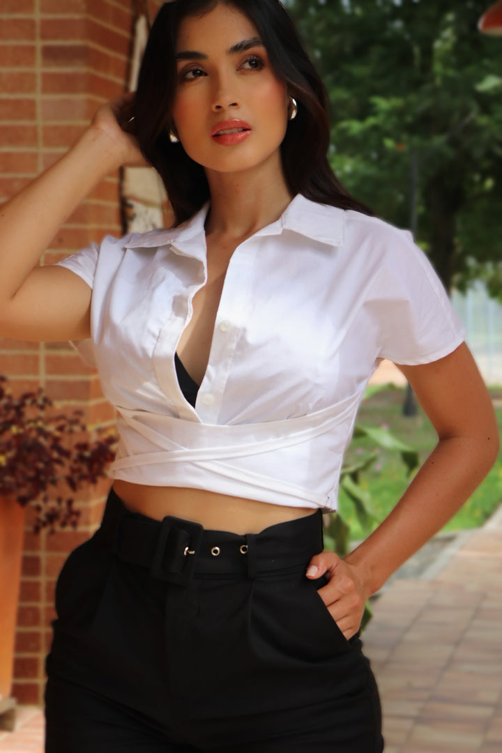 Blusa Crop con cuello camisero y detalle de amarre en la cintura. Elegante y versátil, perfecta para un look casual-chic.