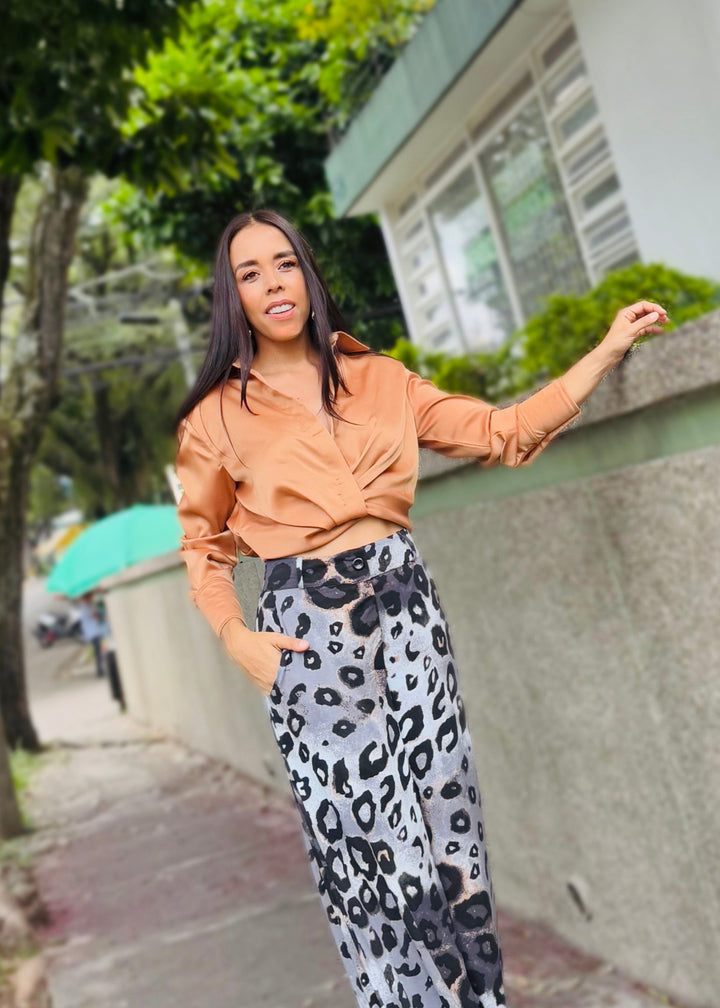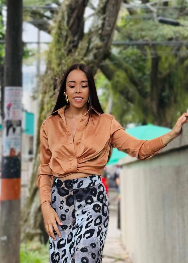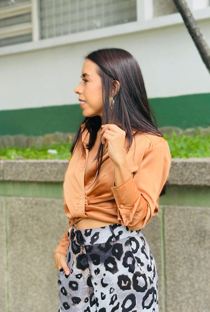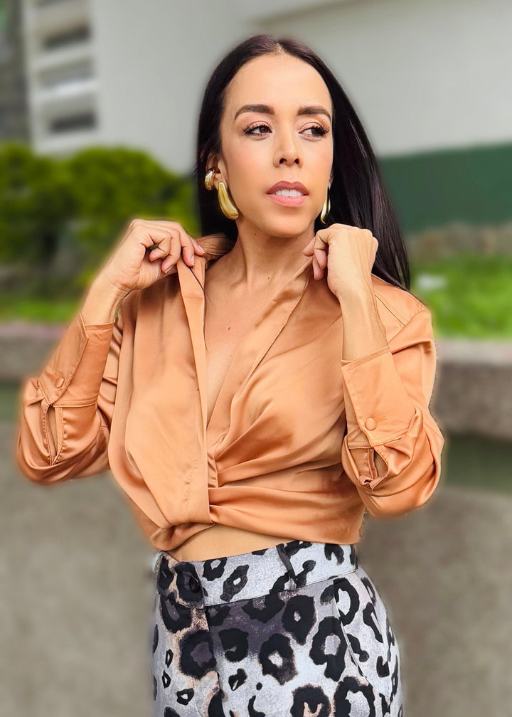 Camisa crop de manga larga con fruncido frontal, cuello camisero y ajuste cómodo. Confeccionada en 90% poliéster y 10% spandex, es ligera, versátil y perfecta para un look elegante y moderno.