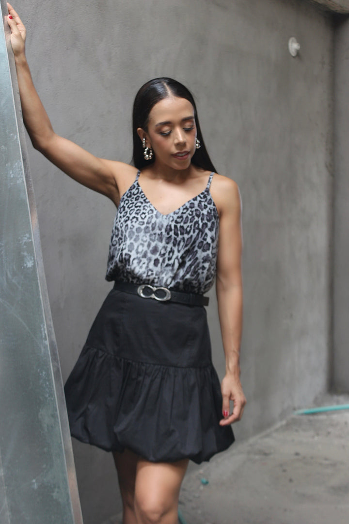 Blusa 100% rayón de tirantes delgados con escote en "V", confeccionada en un tejido ligero y suave al tacto. Destaca por su estampado animal print en tonos neutros, aportando un toque moderno y audaz. Su caída fluida la hace ideal para combinar con faldas o pantalones, creando un look sofisticado y versátil.
