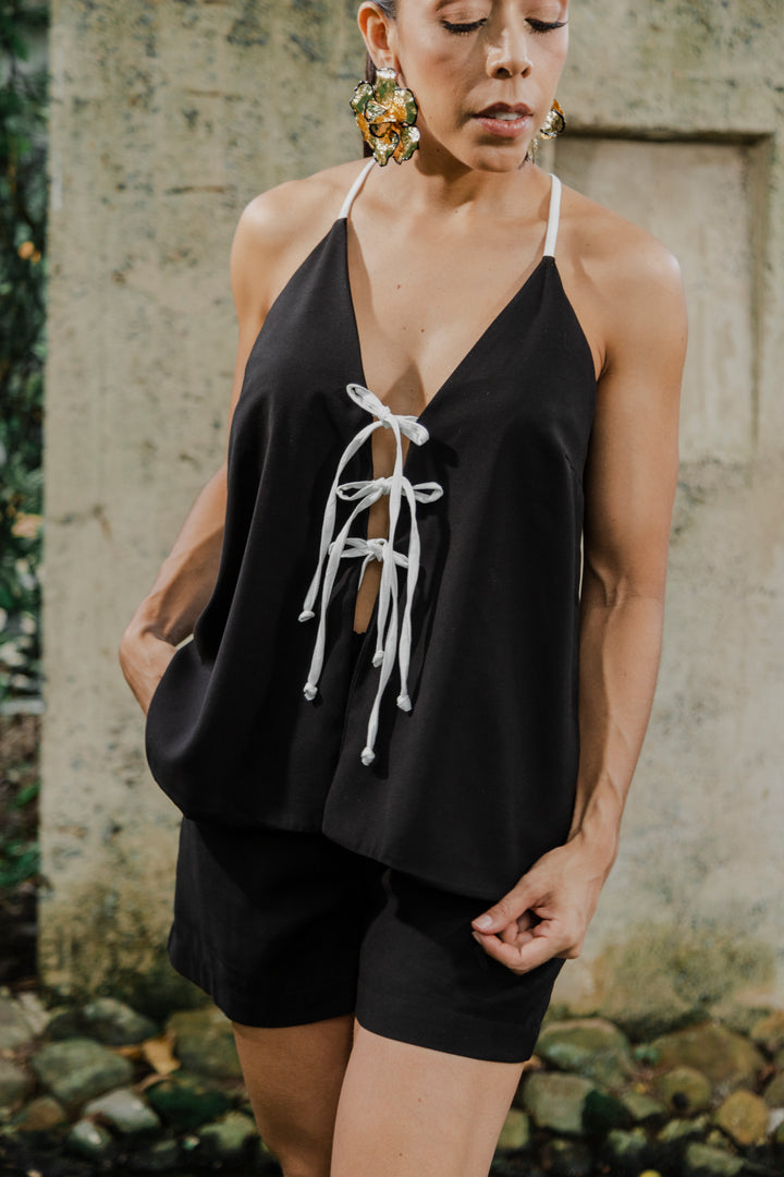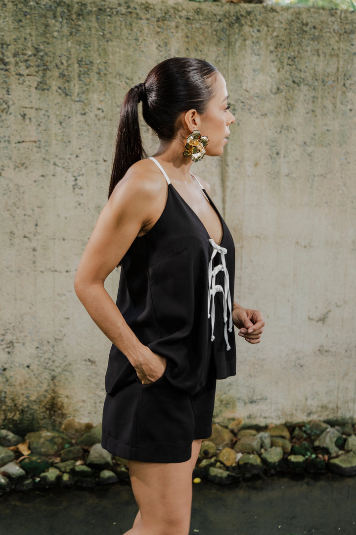 Blusa 90% rayón y 10% poliéster con forro interior para mayor comodidad y cobertura. Destaca por su escote en "V" y un detalle de cordones ajustables en la parte frontal que aportan un toque moderno y versátil. El tejido es ligero, suave al tacto y de caída fluida, ideal para un look fresco y sofisticado.