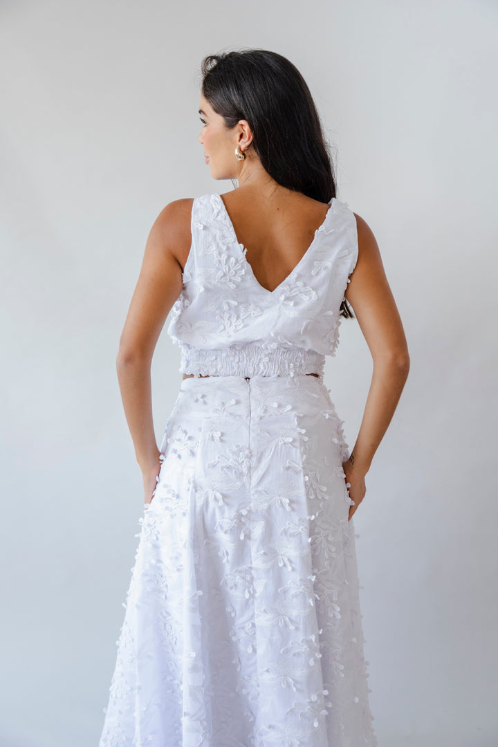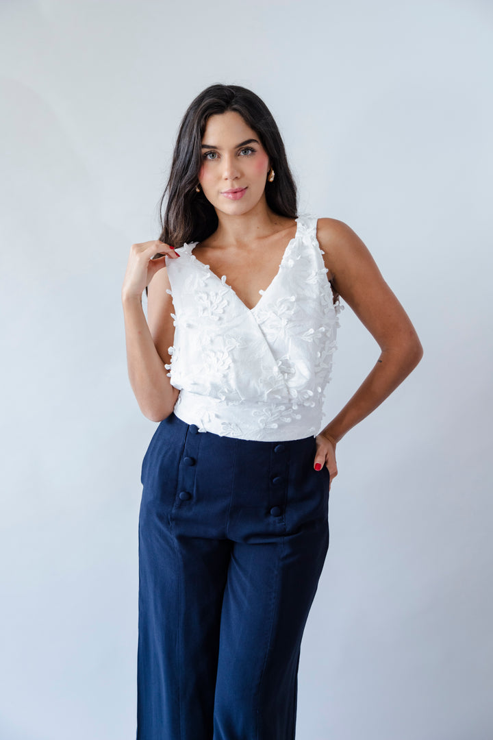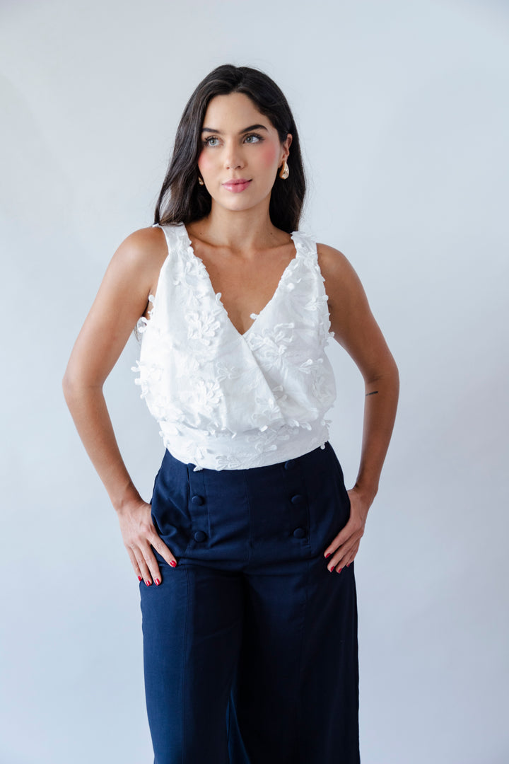 Este crop top es una pieza elegante y versátil, confeccionada en 100% algodón, lo que garantiza frescura y comodidad. Su diseño resalta por un bordado en relieve de poliéster, que le aporta textura y sofisticación. Además, cuenta con un forro interno de algodón, proporcionando mayor cobertura y confort.