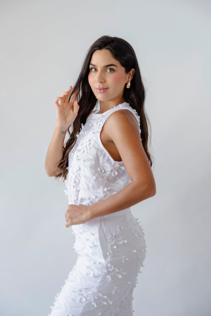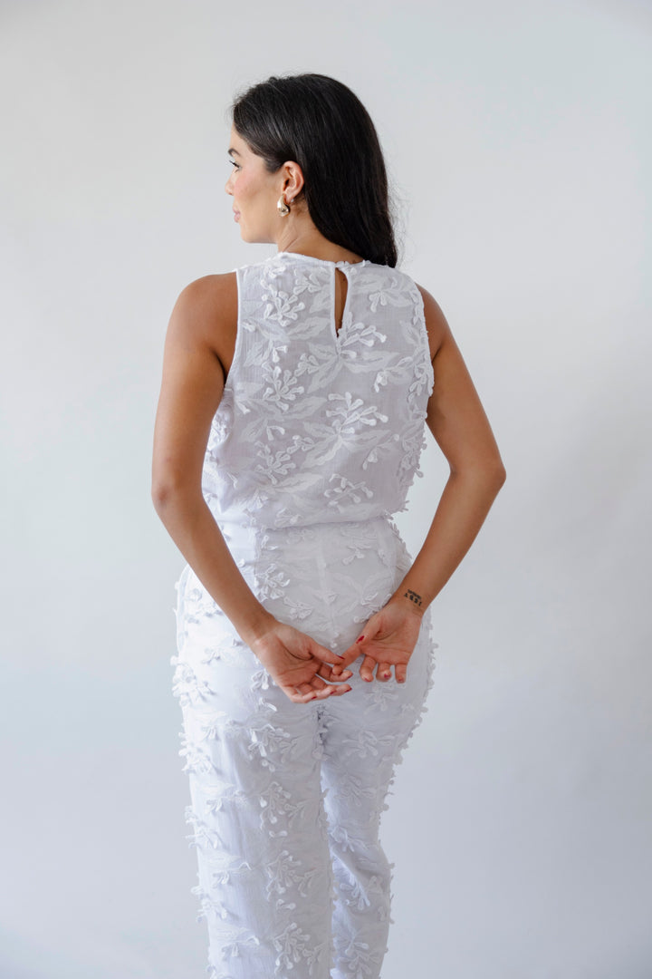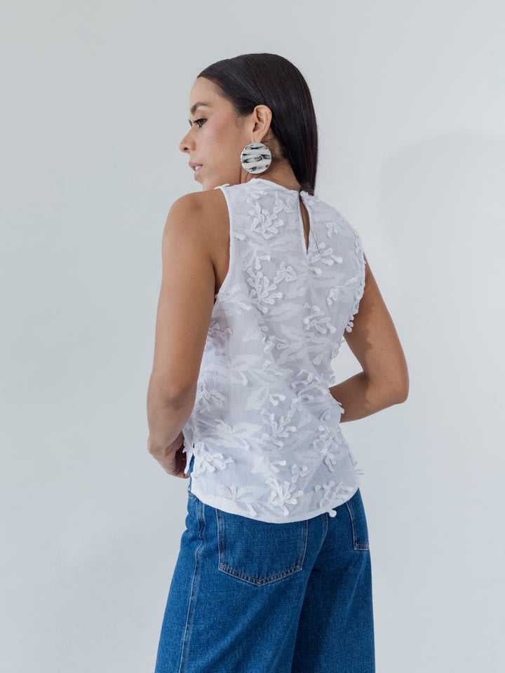 Esta blusa sin mangas es una pieza elegante y versátil, confeccionada en 100% algodón, lo que garantiza frescura y comodidad. Su diseño resalta por un bordado en relieve de poliéster, que le aporta textura y sofisticación. Además, cuenta con un forro interno de algodón, proporcionando mayor cobertura y confort.