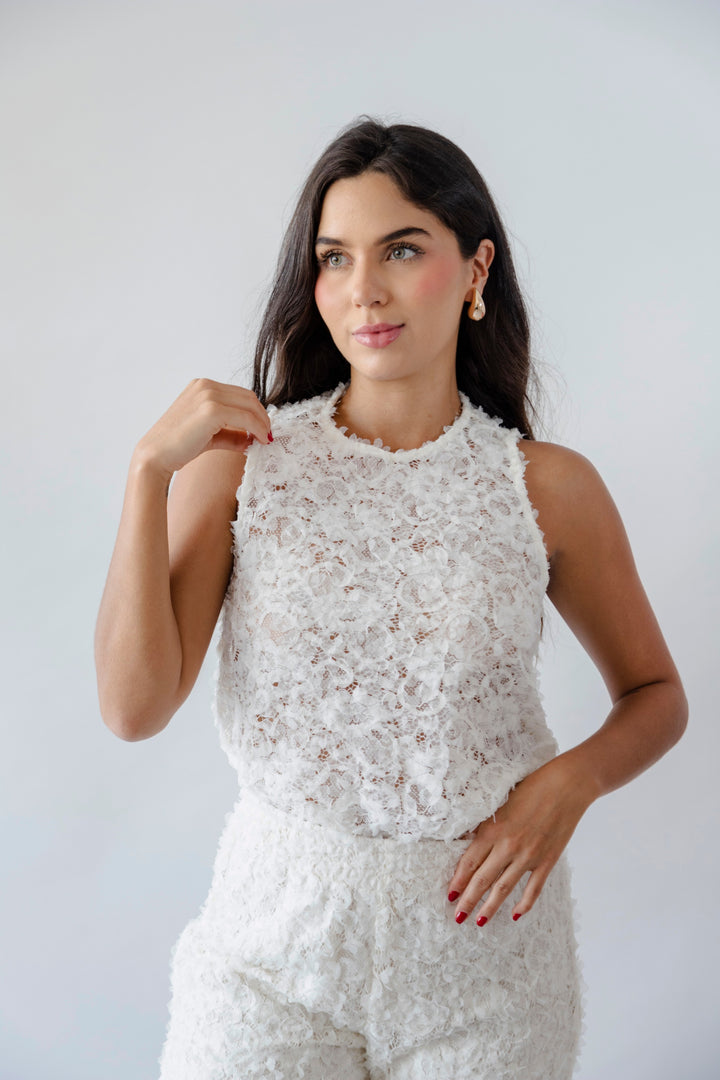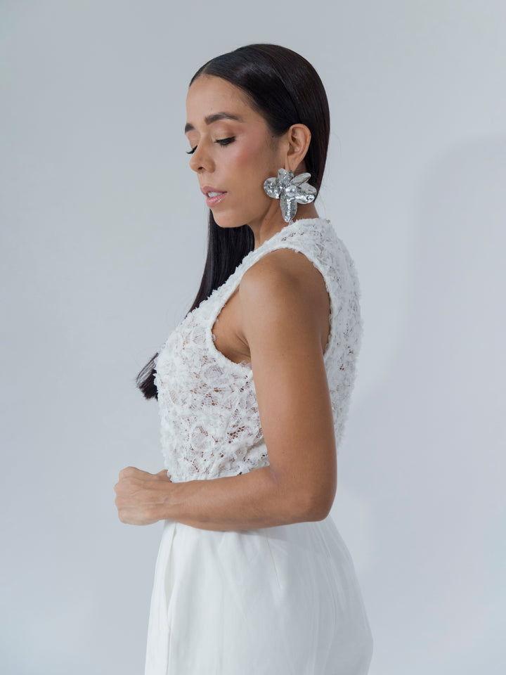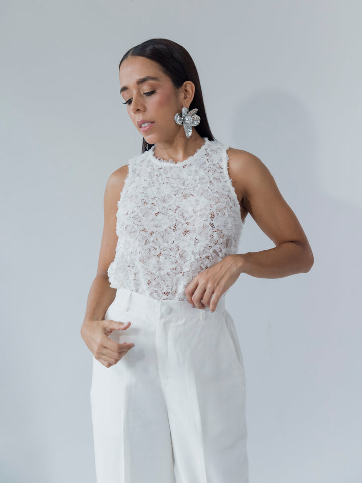 Nuestra blusa de encaje sin mangas es la definición de elegancia y frescura. Su diseño semi-transparente con textura floral aporta un aire romántico y versátil. Elaborada en 71% Poliamida - 22% Poliéster - 7% Spandex