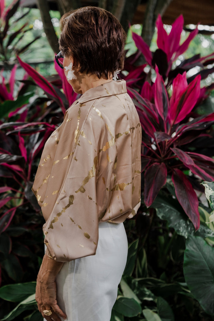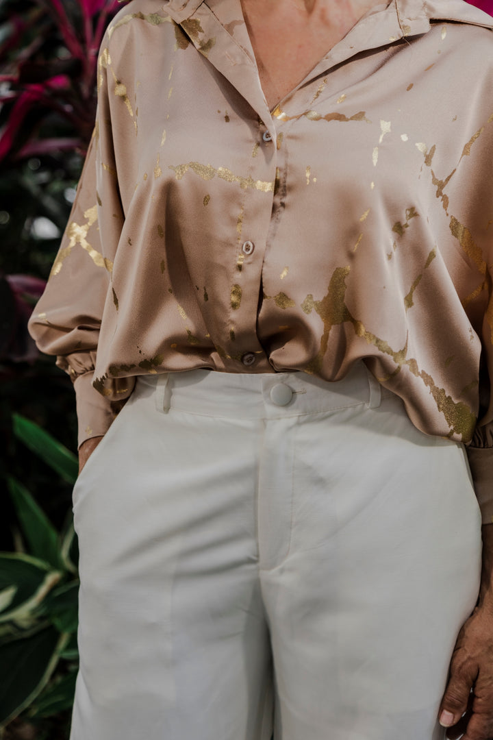 Camisa 100% poliéster con un acabado satinado que aporta un brillo sutil y elegante. Su diseño en tono champagne está adornado con aplicaciones irregulares en dorado, creando un efecto marmoleado moderno y sofisticado.