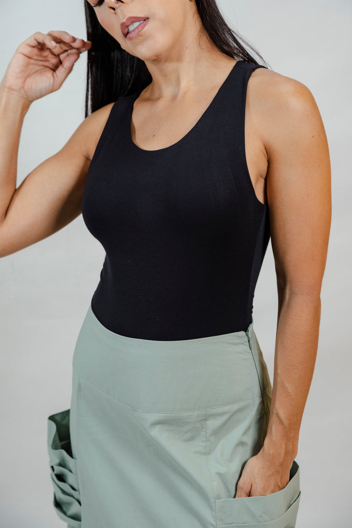 Este body de silueta ajustada y sencilla es una prenda versátil y elegante para cualquier ocasión. Confeccionado en una mezcla de 94% rayón viscosa y 6% elastano, ofrece una textura ultra suave, caída fluida y excelente elasticidad que se adapta al cuerpo con comodidad y estilo.