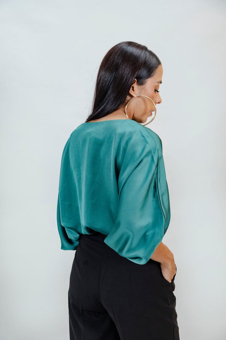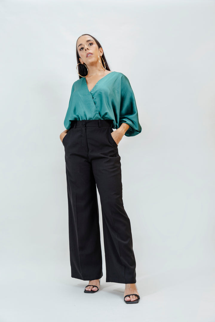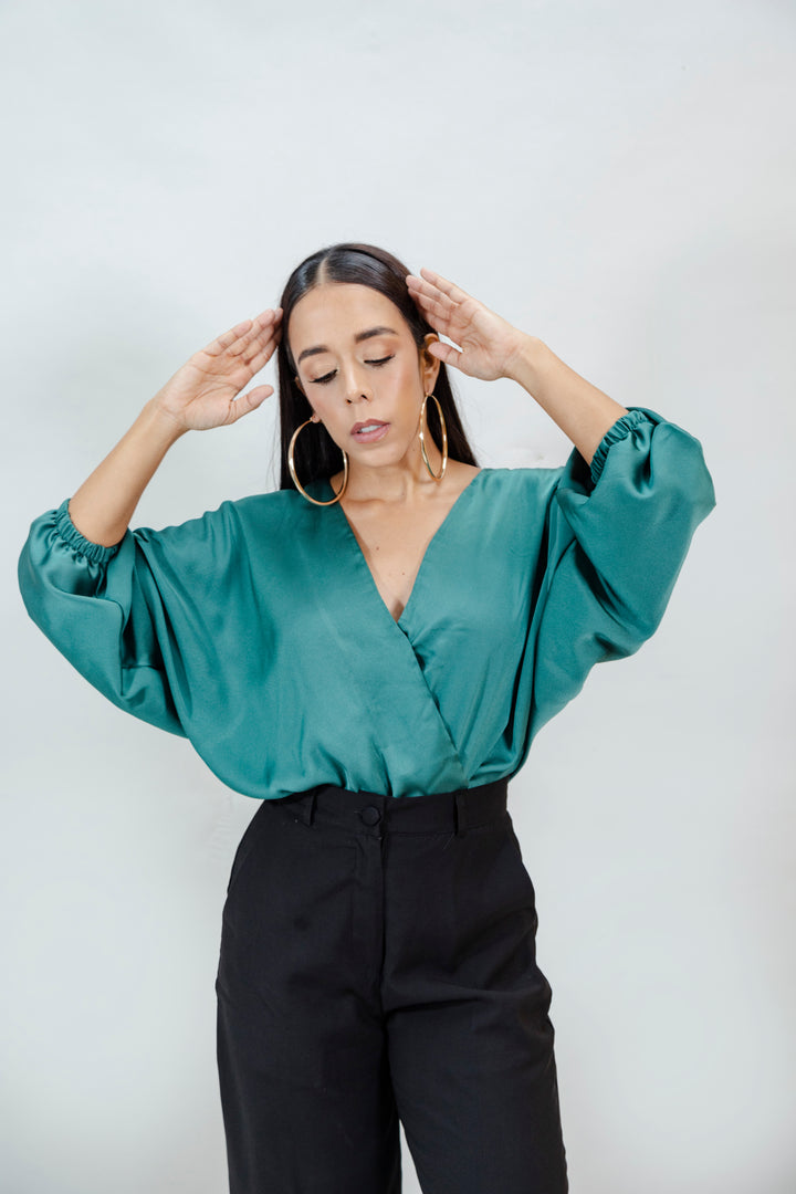 Este body de escote en "V" profundo y silueta cruzada combina elegancia y comodidad. Confeccionado en una mezcla de 90 % poliéster y 10 % spandex, ofrece un acabado satinado con caída ligera y elasticidad sutil que se adapta al cuerpo. Las mangas globo con terminación en elástico aportan un toque sofisticado, ideal para elevar cualquier look, desde lo casual hasta lo formal.
