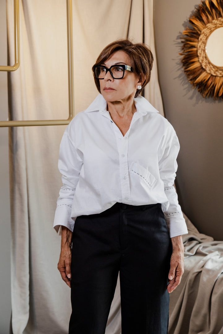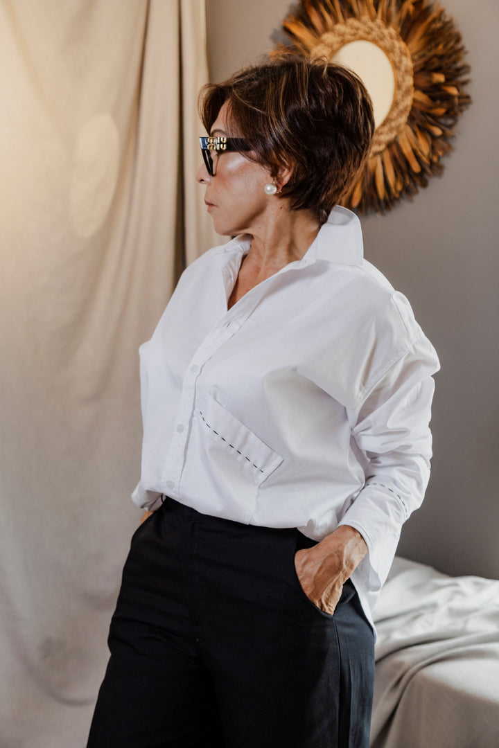 Camisa blanca oversized confeccionada en 100% algodón, perfecta para un look sofisticado y atemporal. Su diseño amplio y estructurado ofrece comodidad sin perder elegancia, con detalles de costuras visibles que añaden un toque de distinción. Ideal para combinar con prendas ajustadas o llevarla de manera relajada para un estilo effortless chic.