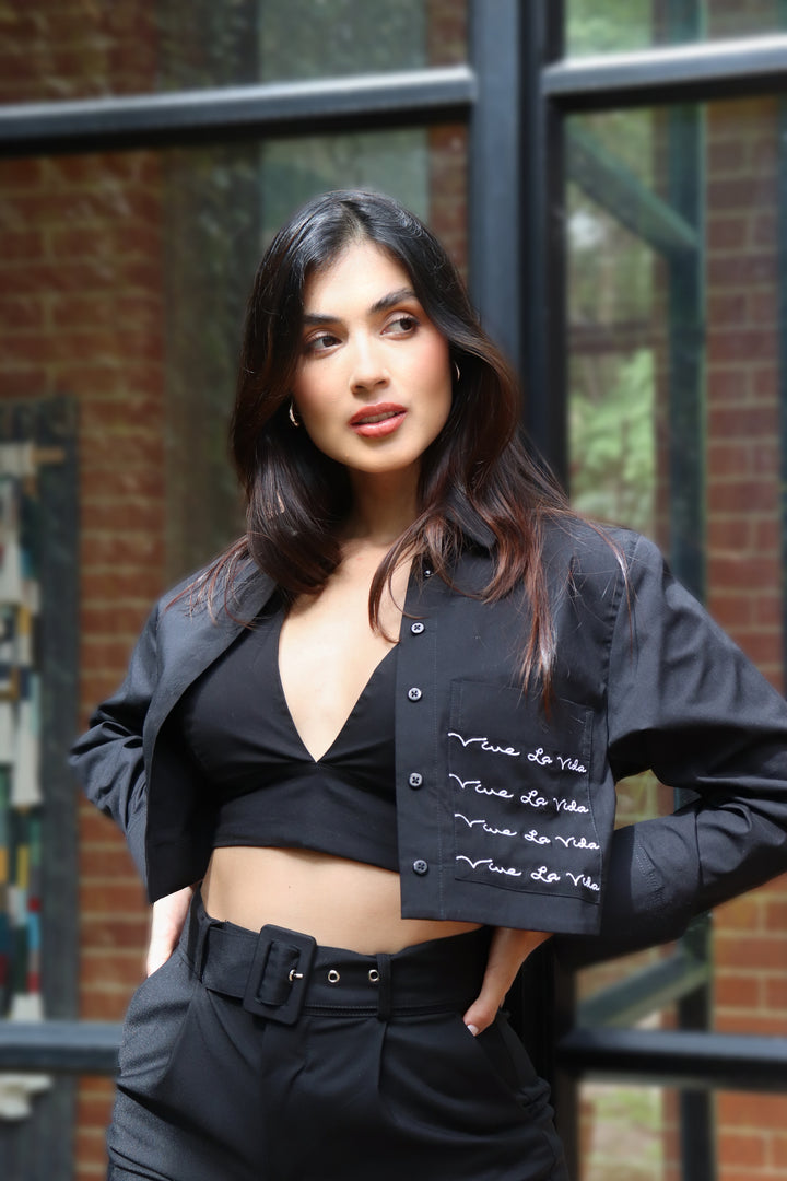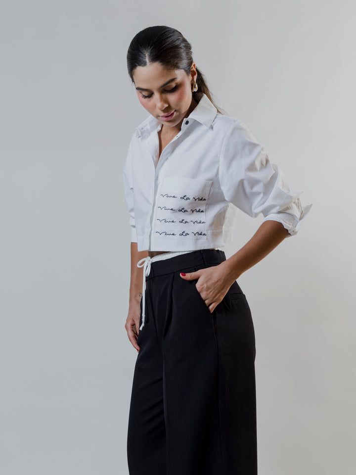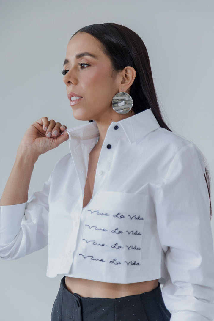 Una prenda que combina estilo y comodidad, esta camisa crop es perfecta para quienes buscan un look fresco y versátil. Su diseño estructurado con cuello clásico y botones negros le da un toque sofisticado, mientras que el bordado “Vive La Vida” en el bolsillo frontal añade un detalle distintivo y motivador.