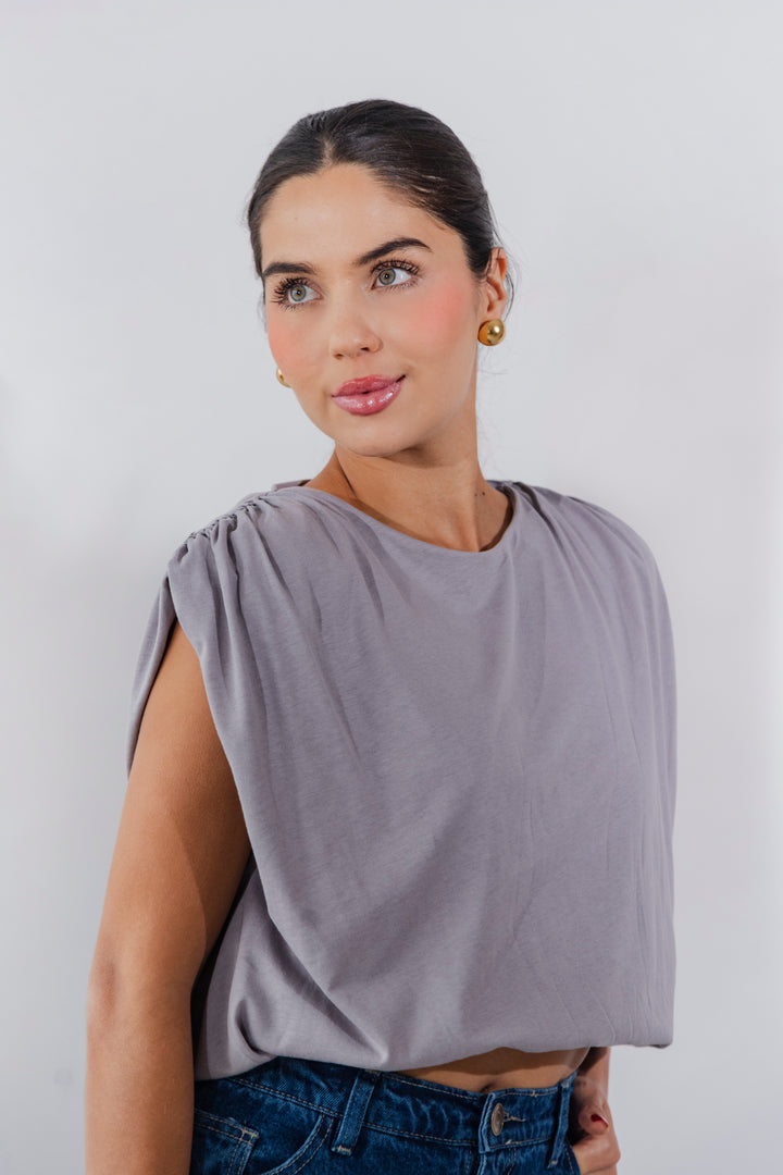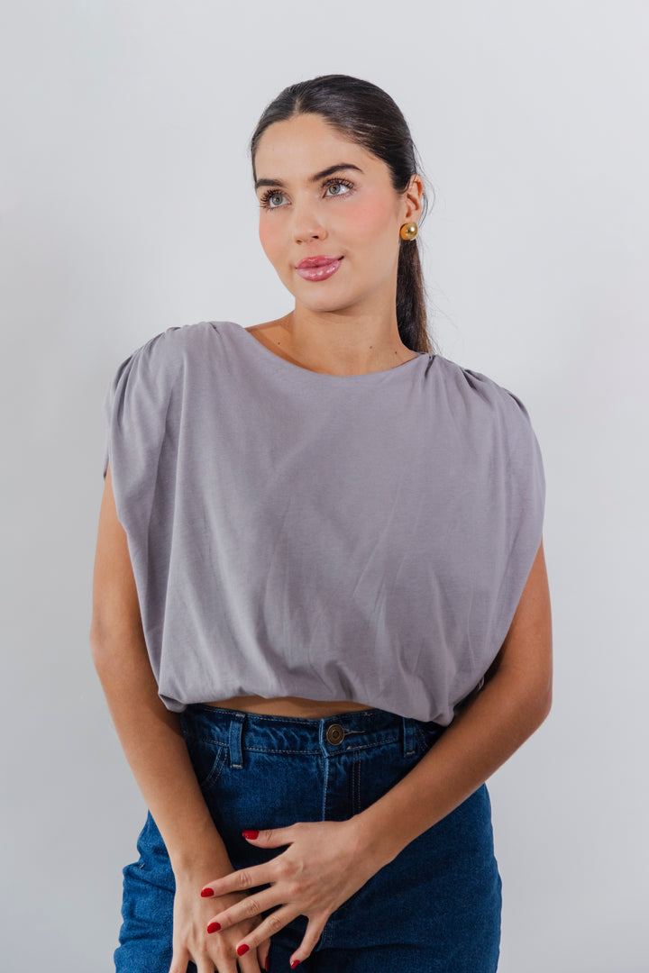 Camiseta de algodón 98% y spandex 2% con un diseño holgado y mangas con frunces en los hombros. Su tejido elástico y suave brinda comodidad y libertad de movimiento, ideal para looks casuales.