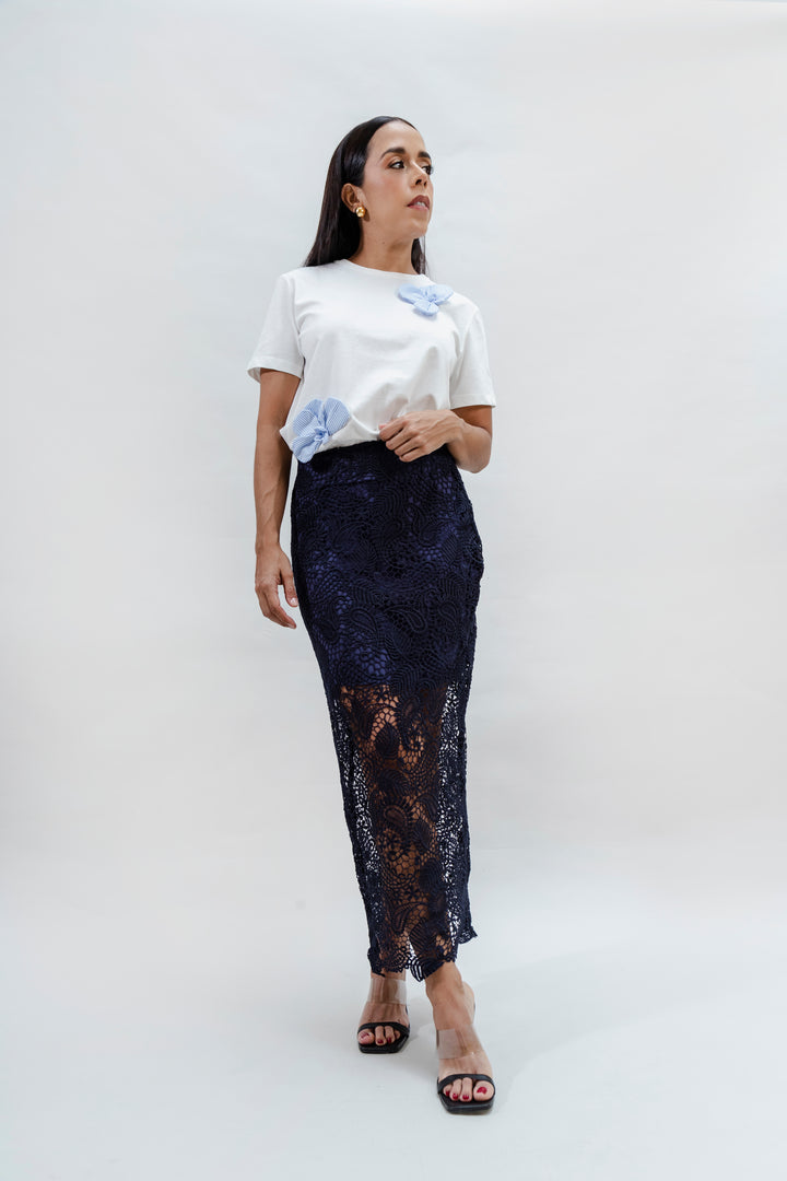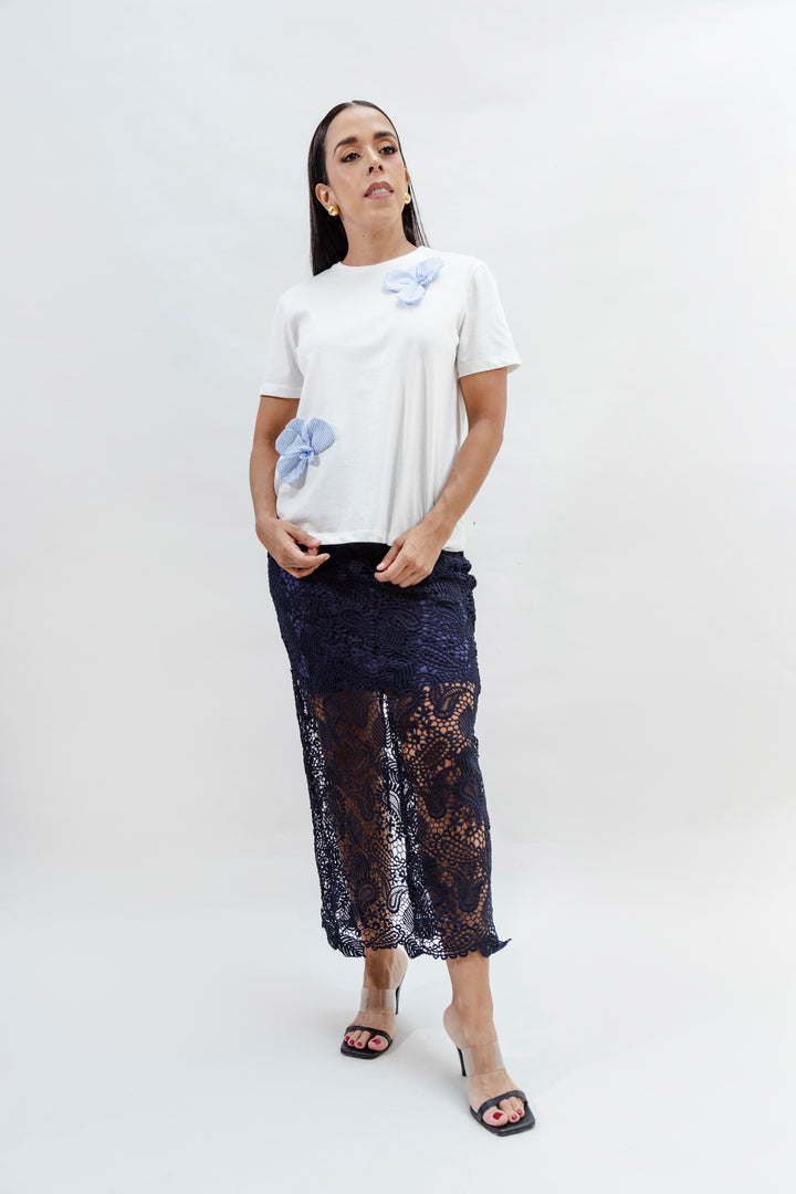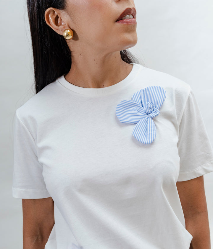 Confeccionada en 100% algodón, aporta frescura, suavidad y comodidad en cada uso. Su diseño se realza con apliques en forma de flores elaboradas en tela rayada, que aportan un toque delicado y diferente. Perfecta para combinar tanto en un look casual como en un outfit más sofisticado.