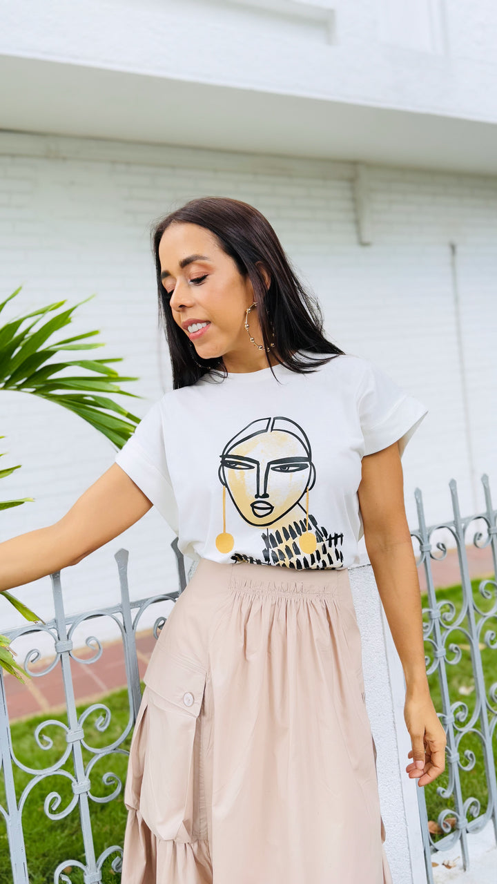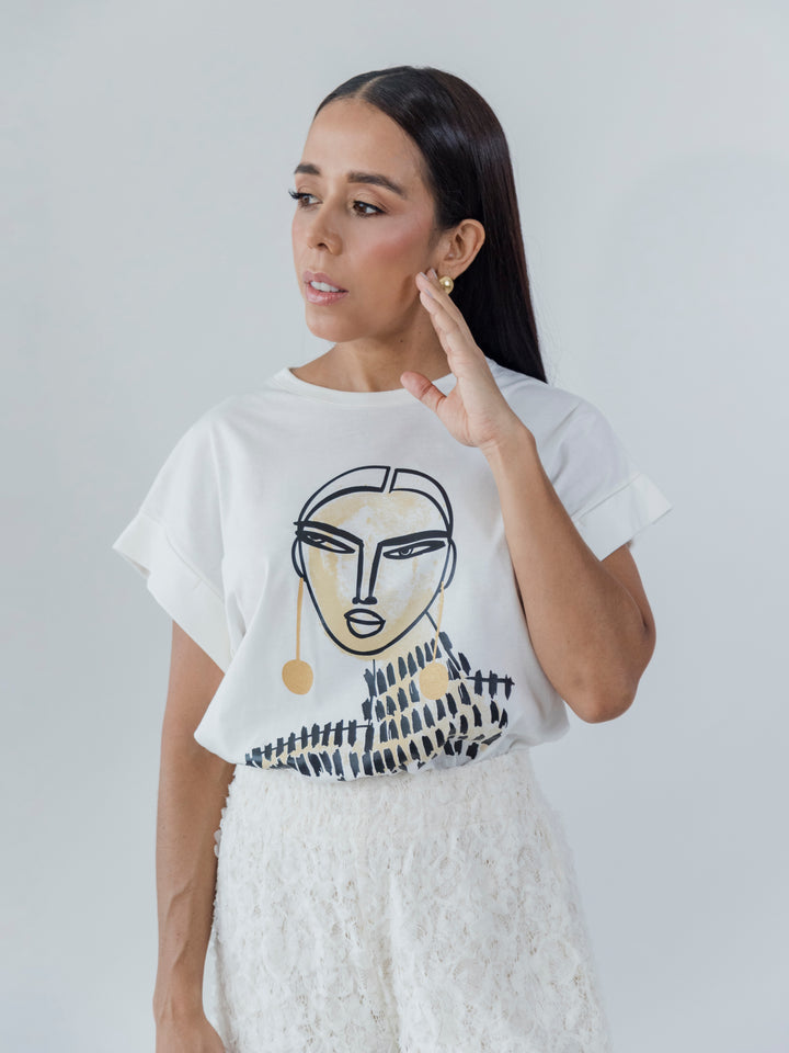 Camisa elaborada en algodón de alta calidad, fresca y suave al tacto, ideal para el uso diario. Su diseño incluye estampado artístico, que aportan un estilo sofisticado y contemporáneo. Cuenta con mangas cortas y silueta cómoda, perfecta para combinar con faldas o pantalones en looks casuales y elegantes.