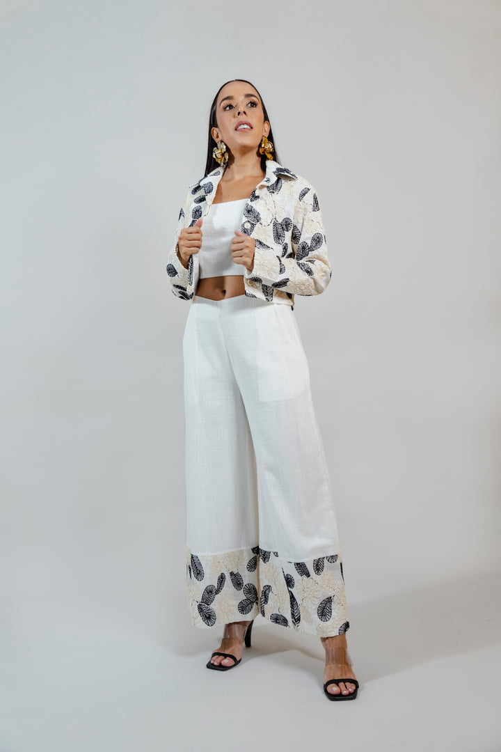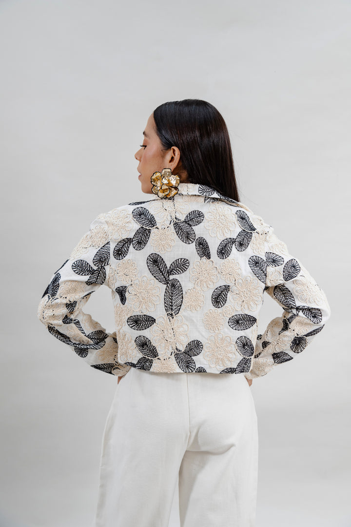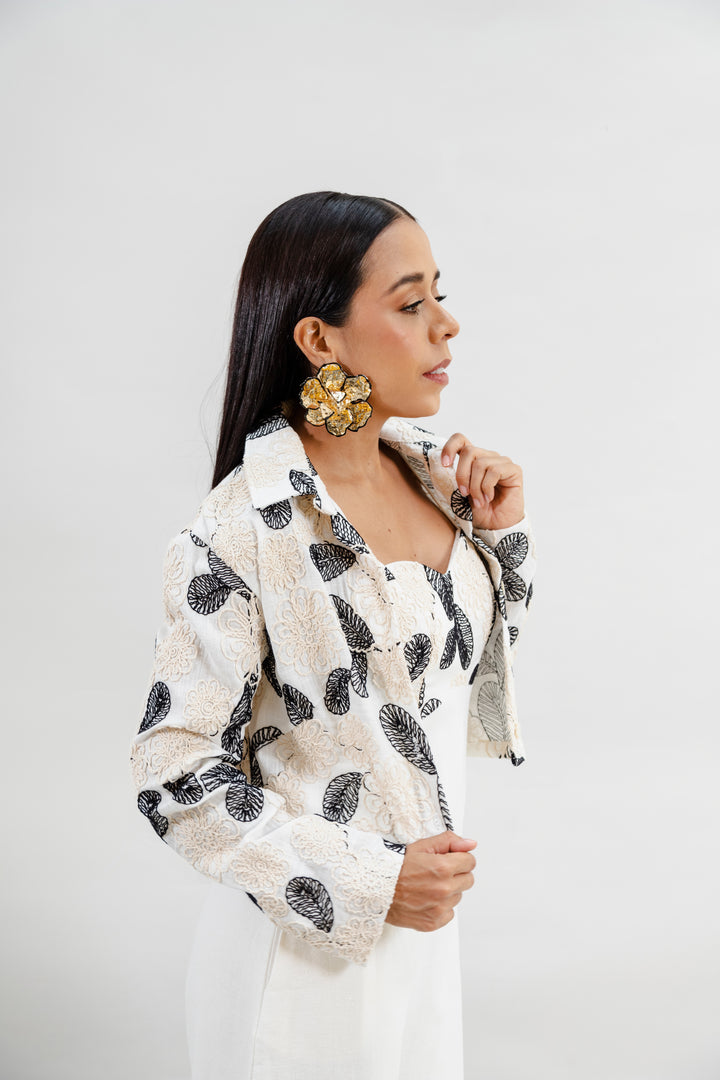 Chaqueta confeccionada en algodón puro, con un diseño elegante en tonos neutros que combina bordados florales en relieve beige y hojas negras. Su silueta es ligera y sofisticada, perfecta para darle un aire fresco y chic a tus outfits. Ideal para ocasiones especiales o para elevar un look casual con un toque distintivo.