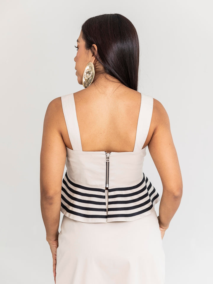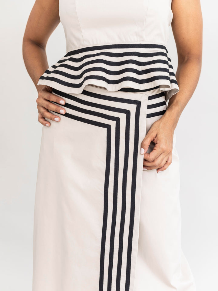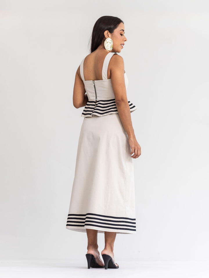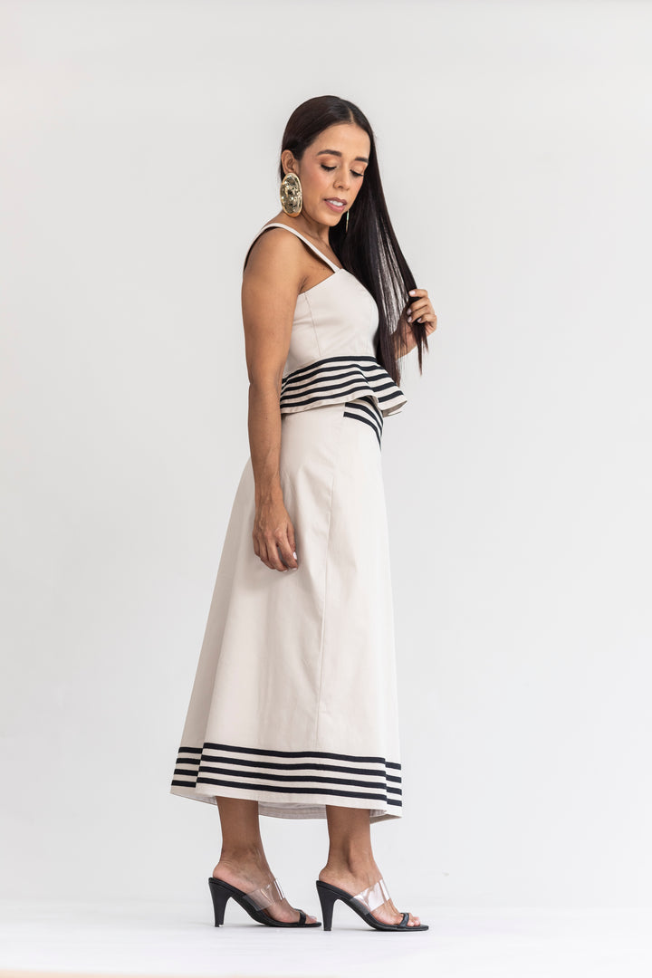 Conjunto elegante elaborado en una mezcla de 96% algodón y 4% spandex, que ofrece comodidad, suavidad y una silueta perfectamente estructurada. Compuesto por un top de tiras anchas y una falda midi con detalle en la cintura, resalta la figura con un aire moderno y sofisticado. Sus líneas en contraste aportan un toque distintivo y actual, ideal para lucir con estilo en ocasiones especiales o en eventos donde quieras destacar con elegancia.