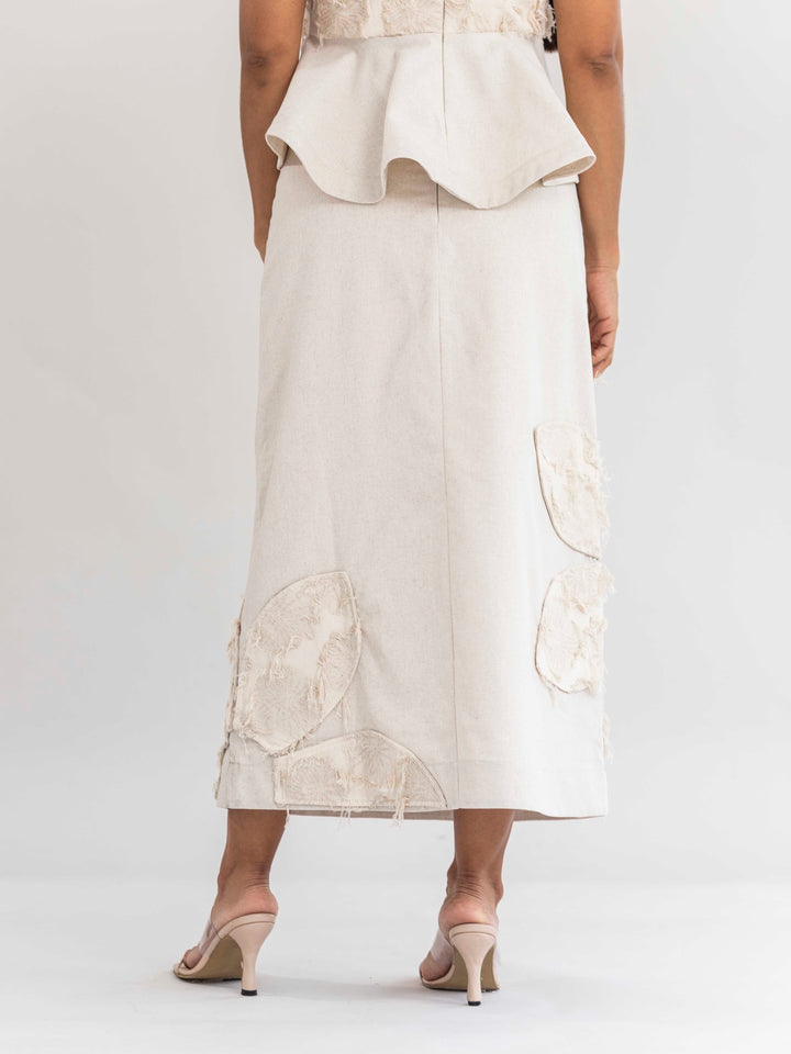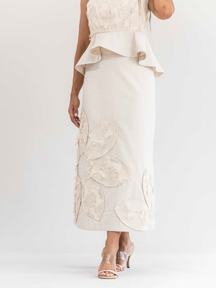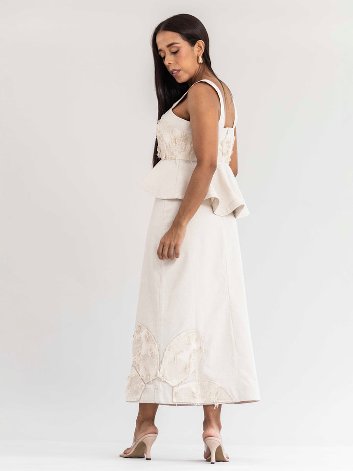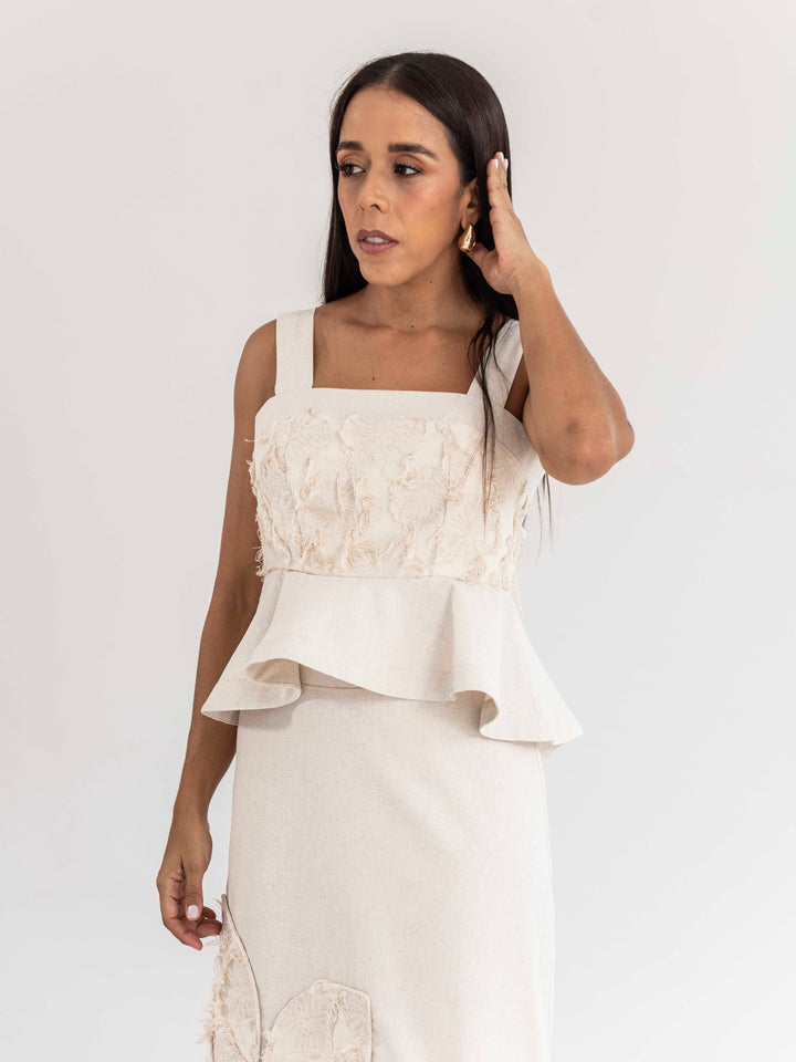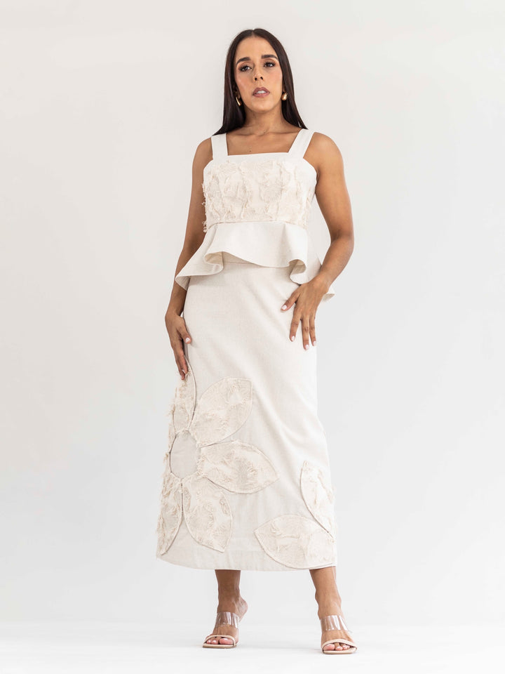 El top cuenta con tiras anchas, un delicado trabajo texturizado en el frente y un sutil volante que aporta movimiento y femineidad. La falda midi, con aplicaciones florales elaboradas en la misma mezcla de fibras, crea un diseño único que celebra los detalles hechos con amor y precisión.