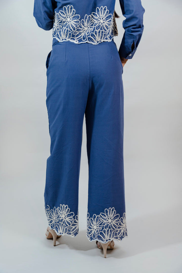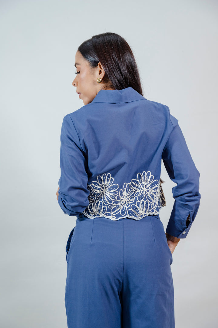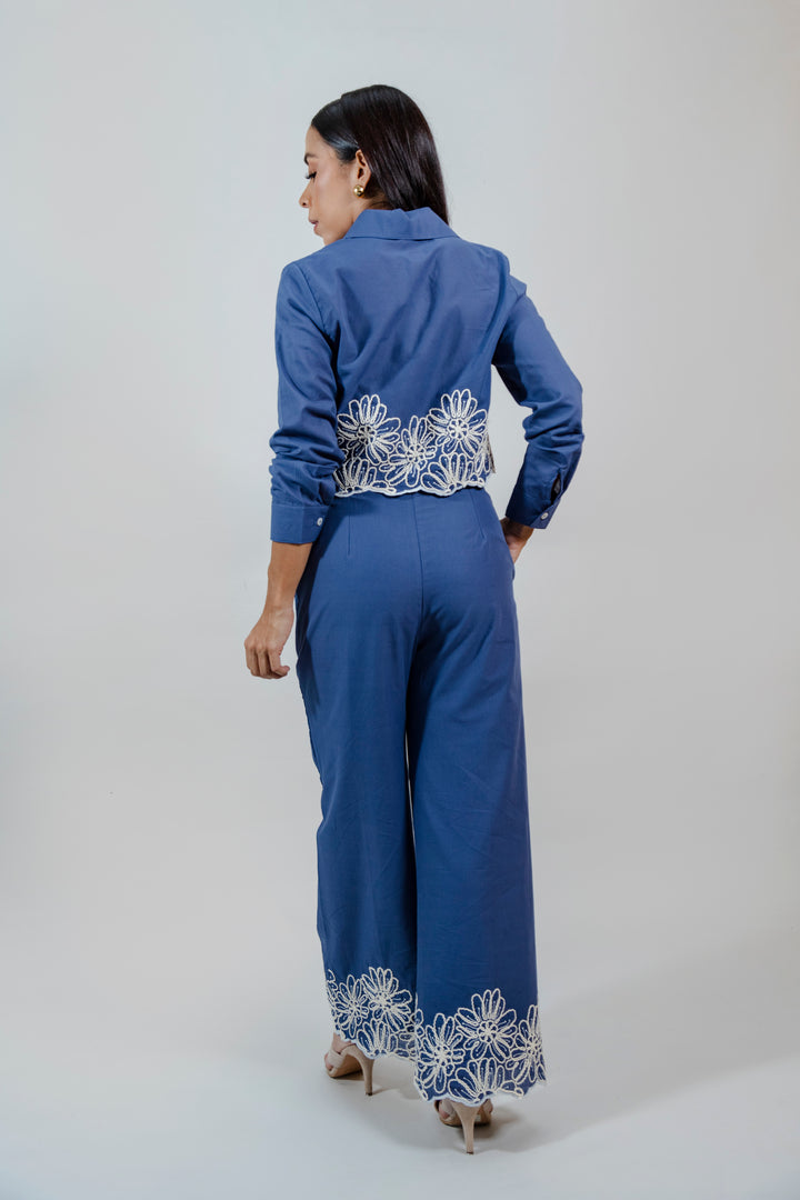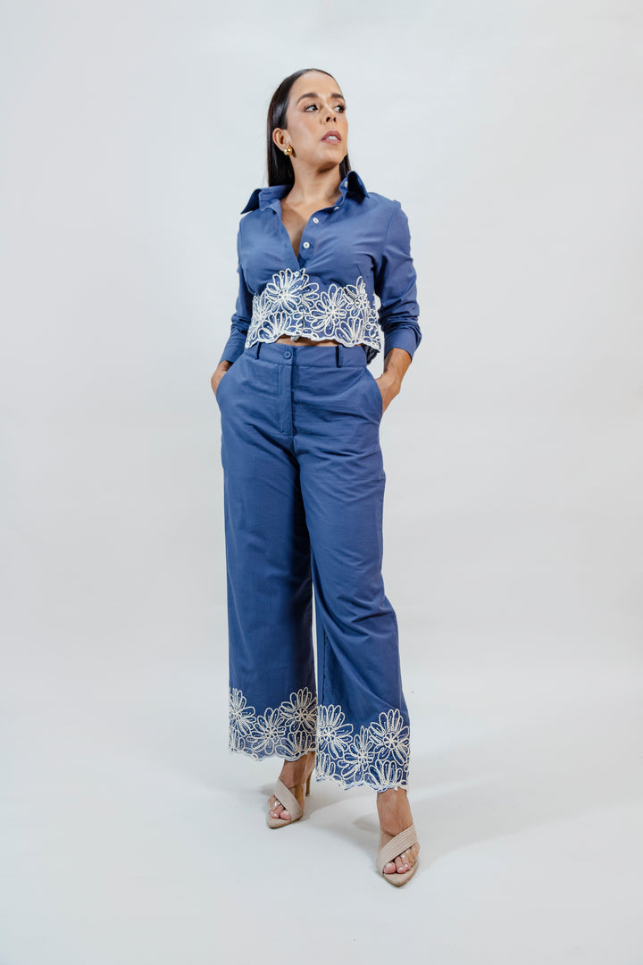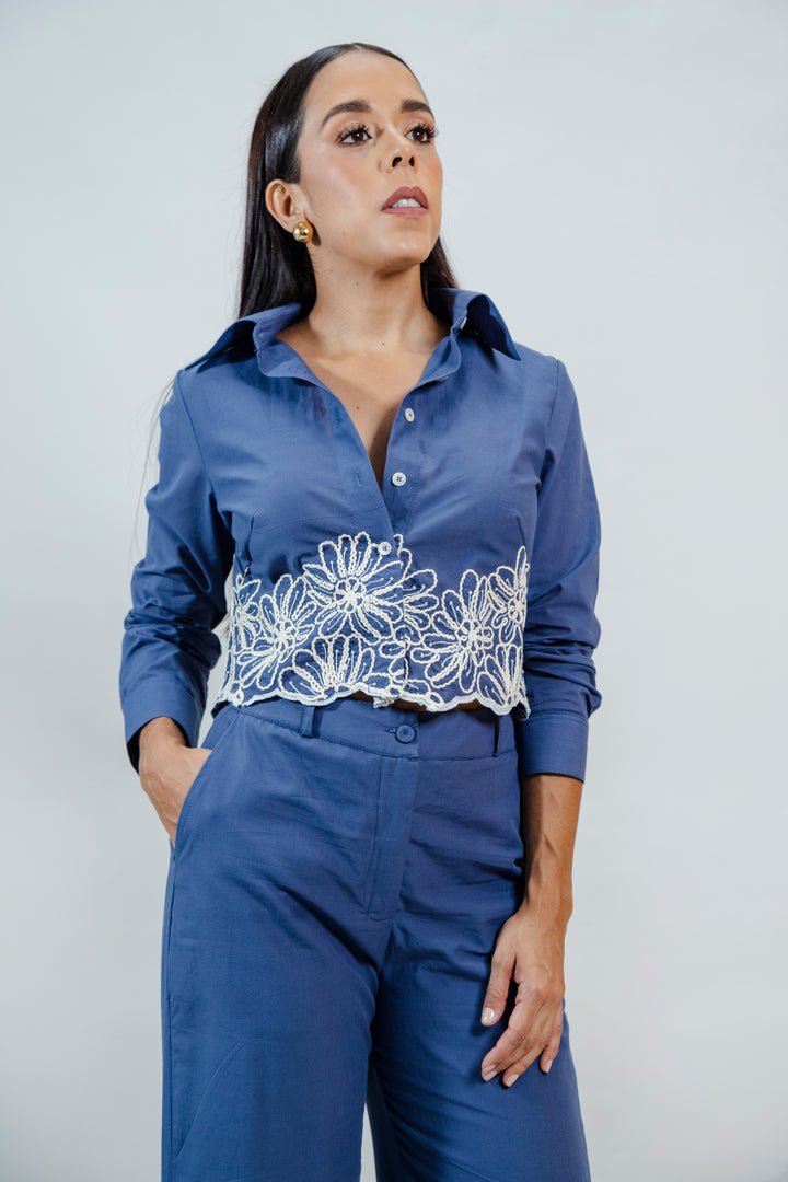 Este conjunto está elaborado en una mezcla de 50% algodón y 50% poliéster, lo que garantiza frescura, comodidad y una excelente estructura. La camisa tipo crop con cuello clásico se destaca por su delicado detalle en encaje floral blanco, que aporta un toque artesanal y femenino. El pantalón de silueta recta a juego incluye el mismo bordado en el ruedo, creando una armonía visual perfecta. Ideal para un look elegante pero relajado.