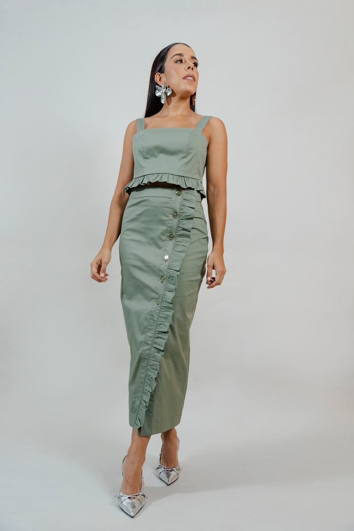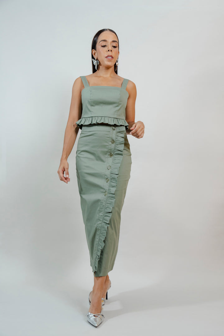 Este conjunto es una apuesta fresca, femenina y cómoda para destacar con estilo. Confeccionado en 96% Algodón y 4% Spandex. El top de tirantes con escote recto y detalle de volante en el ruedo aporta un toque romántico y cierre trasero con botones chic y la falda midi, de silueta ajustada con botonadura lateral y un delicado volante vertical, estiliza la figura y añade movimiento al look. Gracias al spandex, el conjunto ofrece ligero estiramiento para mayor confort.