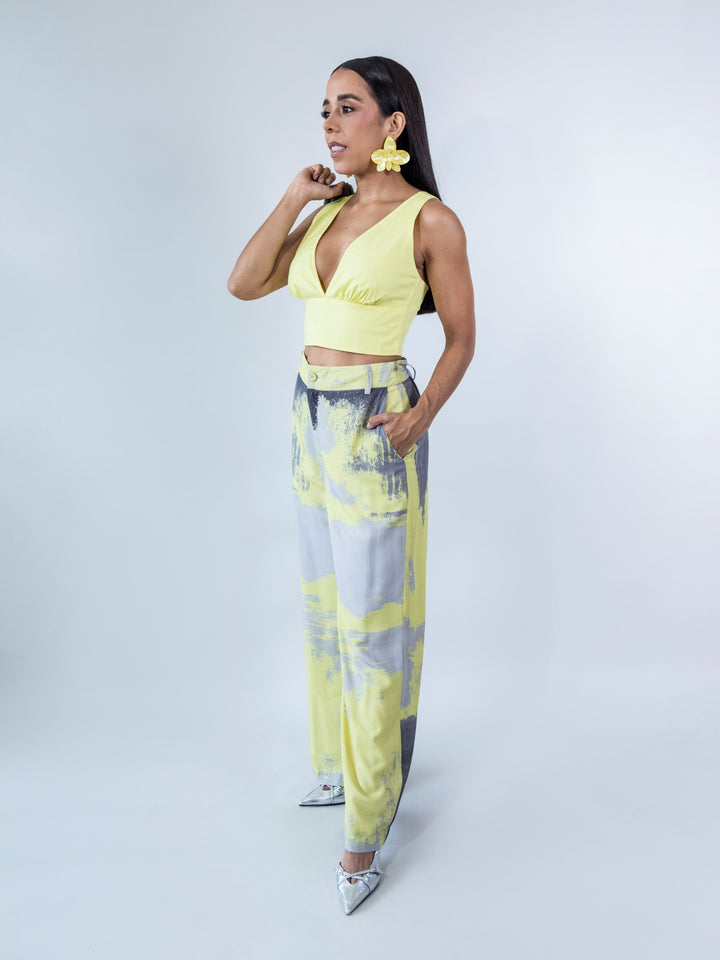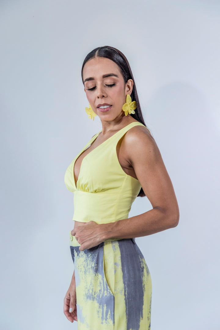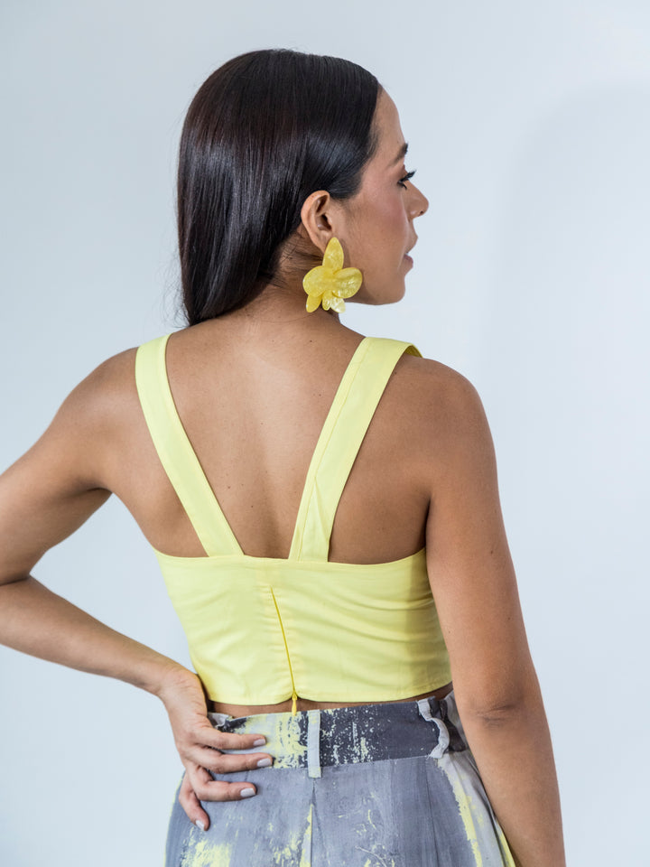 El diseño presenta un ajuste entallado con corte bajo el busto que estiliza la silueta, tirantes anchos y una estructura que brinda soporte sin sacrificar comodidad con cremallera trasera. Ideal para combinar con pantalones de talle alto, tanto lisos como estampados, para un look moderno y lleno de energía.