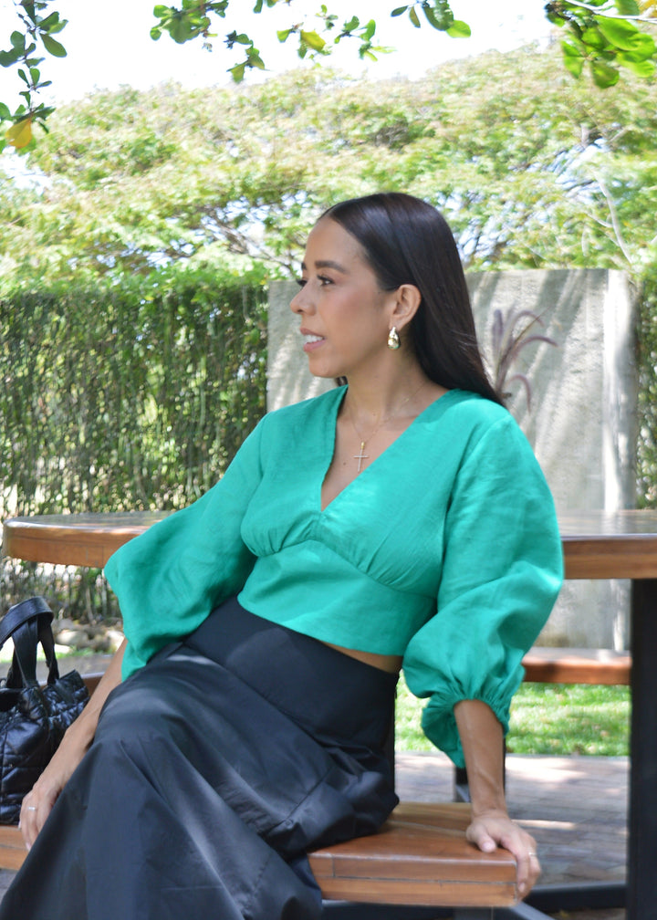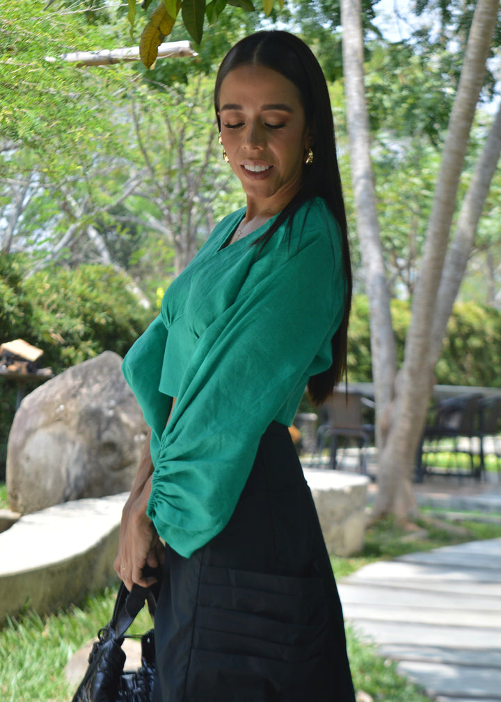 La blusa es de color verde esmeralda, con un diseño elegante y sofisticado. Está confeccionada en 100% lino, lo que le otorga una textura fresca y ligera, ideal para climas cálidos. Destaca por: