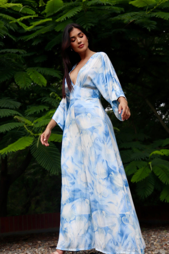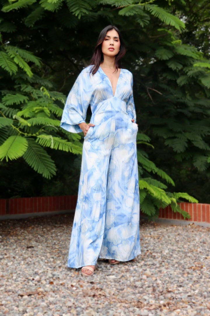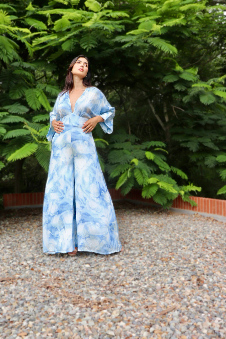 Enterizo confeccionado en 100% rayón viscosa y forro en algodón, una tela ligera, fresca y con movimiento natural, este enterizo es ideal para los días cálidos donde la comodidad no está reñida con el estilo. Su estampado tipo acuarela en tonos celeste y blanco aporta un aire suave y artístico. El diseño de escote en “V” y mangas amplias realza la silueta con elegancia y soltura. Una prenda que fluye contigo y se adapta a cualquier ocasión especial o casual.
