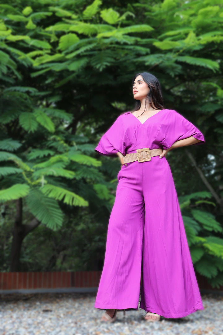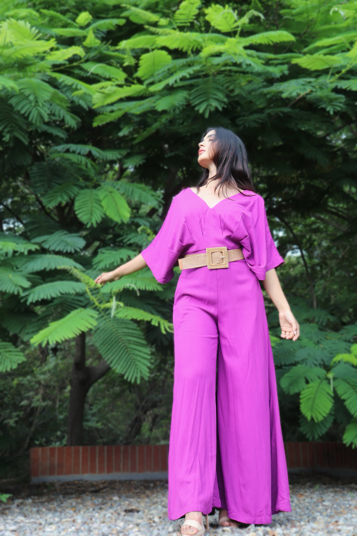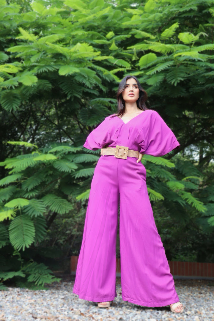 Este enterizo confeccionado 100% en rayón viscosa y forro en algodón que ofrece una caída impecable y una sensación ligera al tacto. Su vibrante color fucsia irradia energía y estilo, mientras que las mangas amplias y el pantalón de bota ancha crean una silueta impactante y sofisticada. La tela aporta frescura y fluidez, ideal para climas cálidos o eventos donde quieras destacar con elegancia y comodidad.