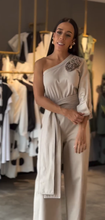 Enterizo en algodón suave con un toque de spandex que aporta comodidad y ligera elasticidad. Su diseño asimétrico de un solo hombro crea un efecto moderno y sofisticado, acompañado de una flor textil que añade un detalle femenino y elegante. La cintura amplia y cruzada estiliza la figura y define la silueta, mientras el pantalón recto brinda una caída fluida y favorecedora. Una pieza versátil para ocasiones especiales o looks chic del día a día.