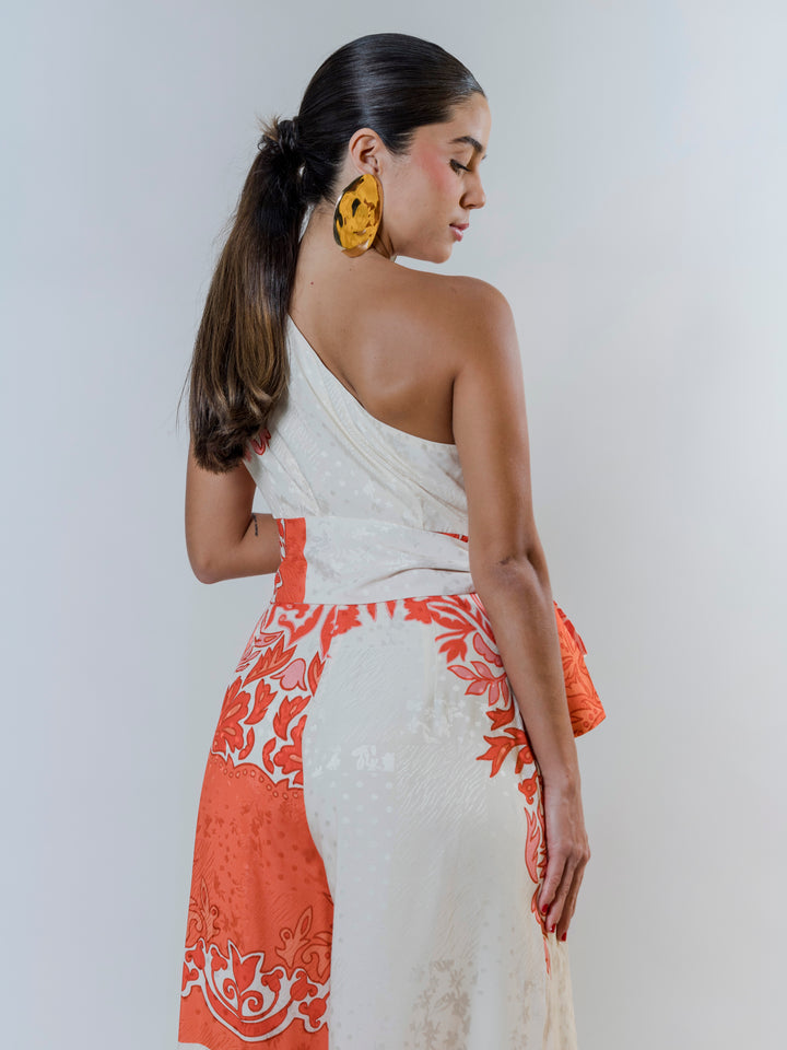 Con un estampado exclusivo en tonos coral y blanco, su silueta amplia y lazo en la cintura estilizan la figura con un aire sofisticado y relajado a la vez.