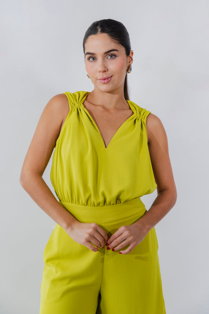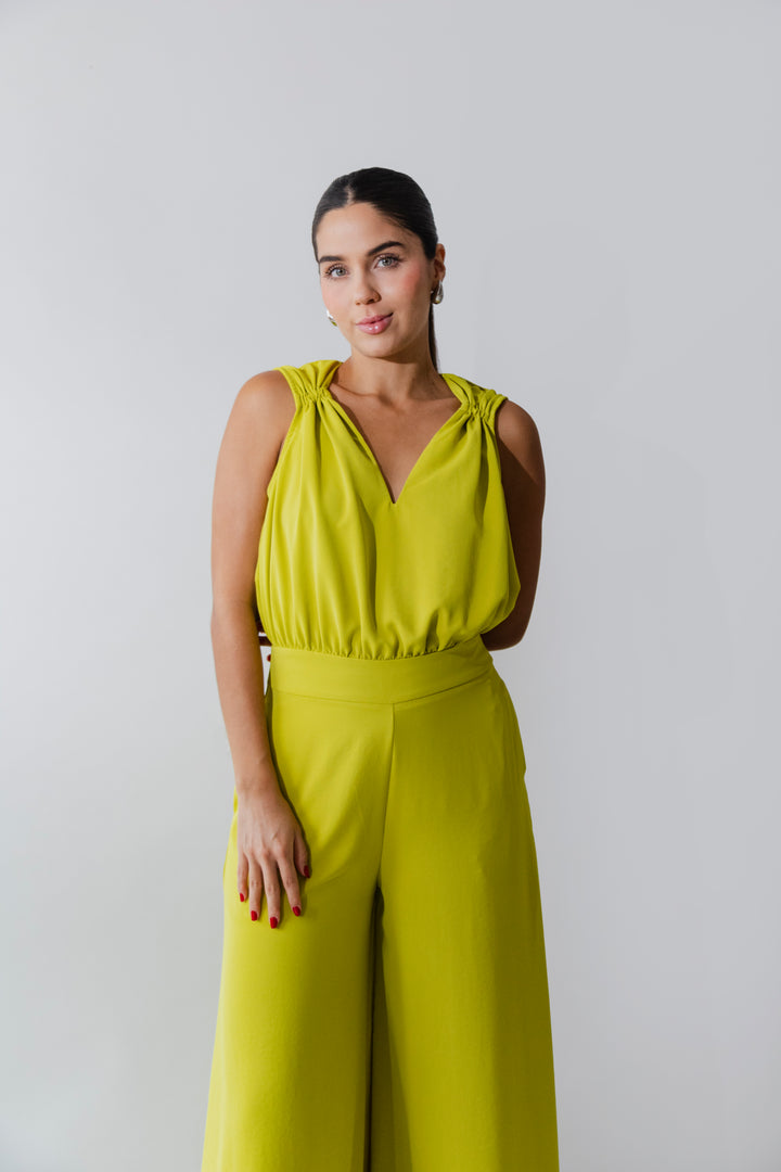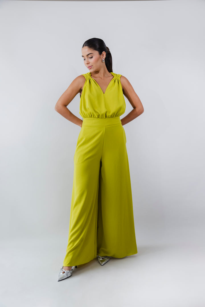 Este enterizo de silueta amplia y sofisticada destaca por su diseño sin mangas, escote en V con delicados recogidos y pretina que define la cintura. Su pantalón de pierna ancha brinda un movimiento fluido y elegante. Confeccionado en 100 % poliéster, garantiza una caída ligera y una apariencia pulida. Cierre posterior con botón y cremallera oculta para un ajuste cómodo y funcional.