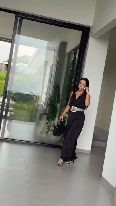 Este enterizo de silueta amplia y sofisticada destaca por su diseño sin mangas, escote en V con delicados recogidos y pretina que define la cintura. Su pantalón de pierna ancha brinda un movimiento fluido y elegante. Confeccionado en 100 % poliéster, garantiza una caída ligera y una apariencia pulida. Cierre posterior con botón y cremallera oculta para un ajuste cómodo y funcional.