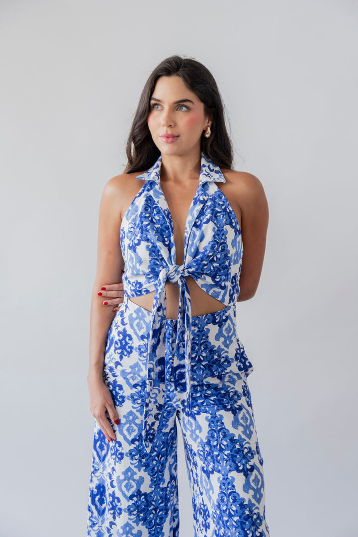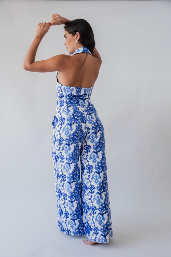 Enterizo diseñado con amarre frontal, escote halter con cuello camisero y pierna ancha para un look elegante y fluido. Su estampado azul y blanco evoca la esencia mediterránea de Santorini, ideal para cualquier ocasión. Confeccionado en 100% Rayón Viscosa.