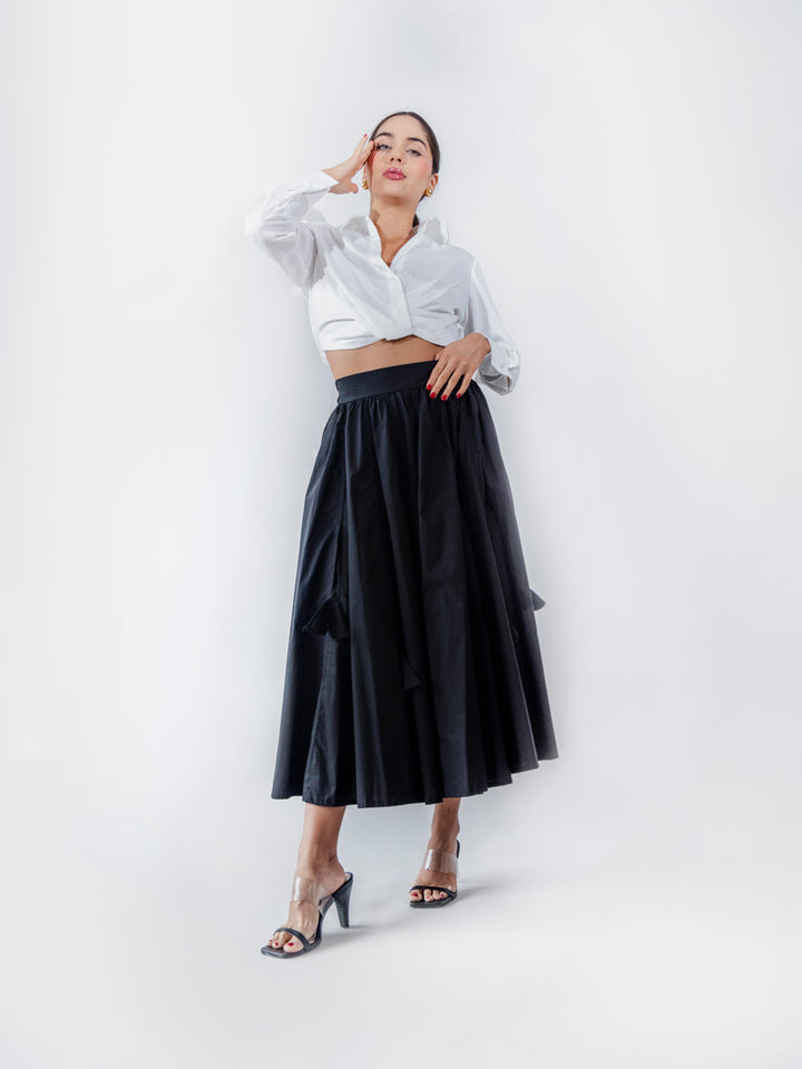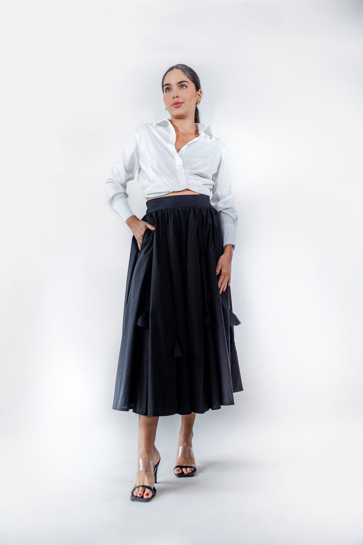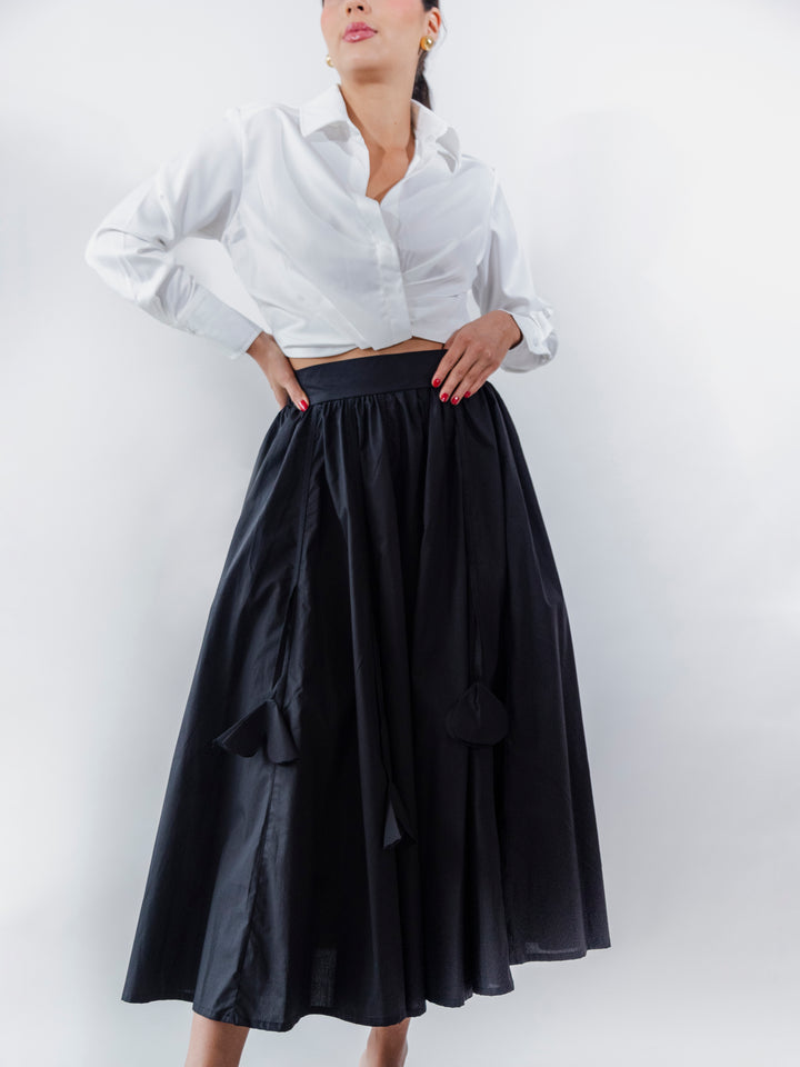 Falda midi 100% algodón, con cintura estructurada y caída amplia para un efecto fluido. Los lazos decorativos añaden un detalle distintivo, creando un look elegante y moderno.