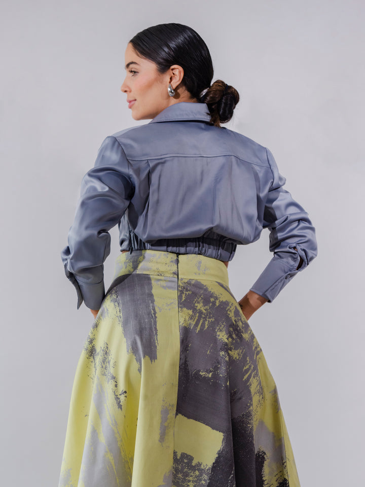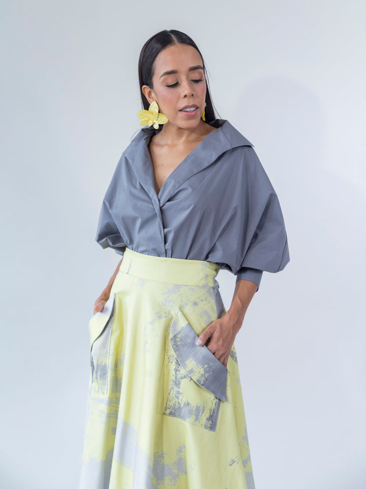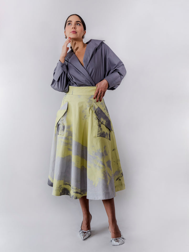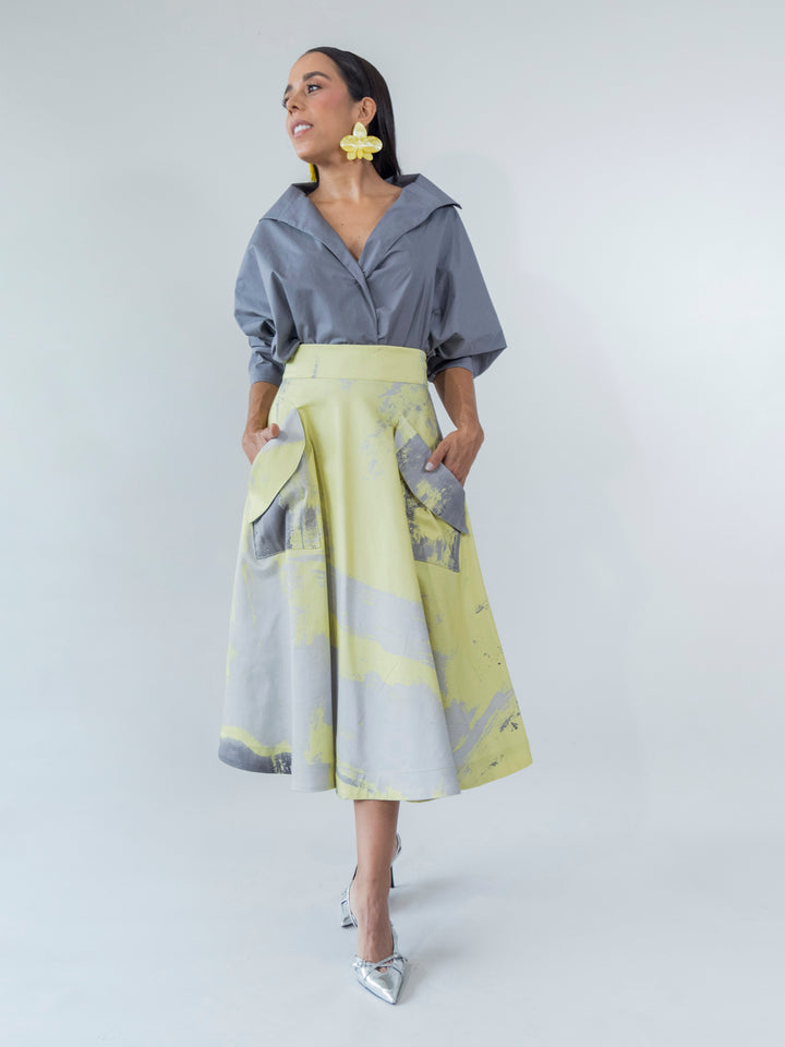 Falda con silueta largo midi, confeccionada en 100 % algodón que aporta frescura, estructura y libertad de movimiento. Destaca por su estampado artístico en tonos gris y amarillo, que añade un toque contemporáneo y dinámico a cualquier look.