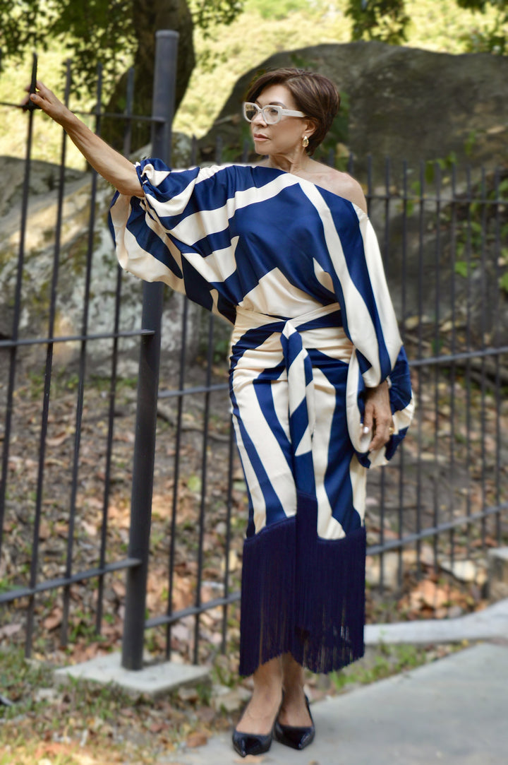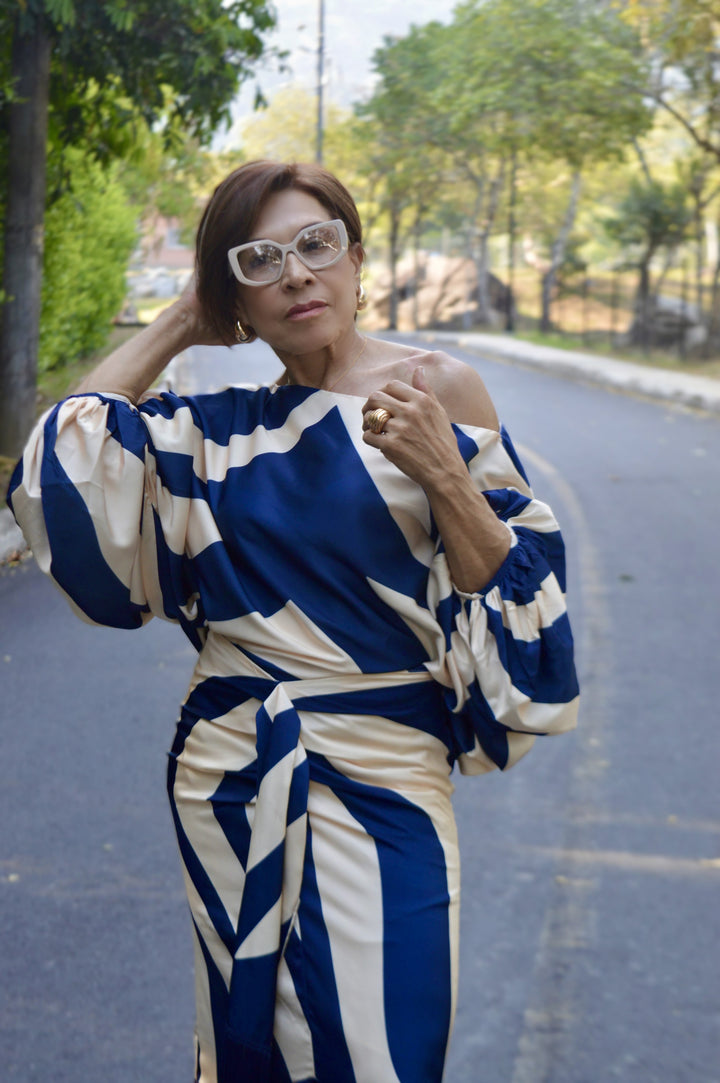 Falda midi forrada en 98% poliéster y 2% spandex, con estampado geométrico en tonos azul marino y marfil. Destaca por su nudo frontal drapeado que estiliza la figura y flecos en el ruedo que añaden un toque dinámico. El forro interior asegura comodidad y un ajuste impecable, perfecta para un estilo sofisticado.