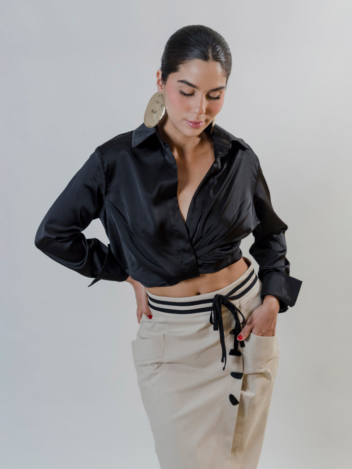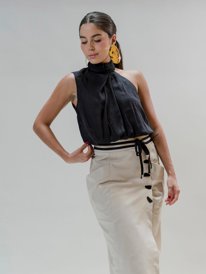 Esta falda es una expresión de elegancia natural y sofisticación relajada. La falda midi, confeccionada en una mezcla de 97% algodón y 3% spandex, ofrece una silueta estructurada pero cómoda, gracias a su ligera elasticidad. Destaca por su diseño asimétrico con abotonadura lateral decorativa, un cordón ajustable en la cintura con detalle de rayas, y una abertura frontal que aporta movimiento.