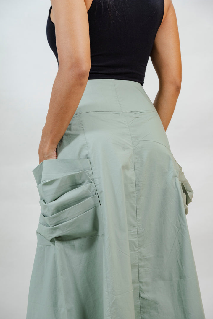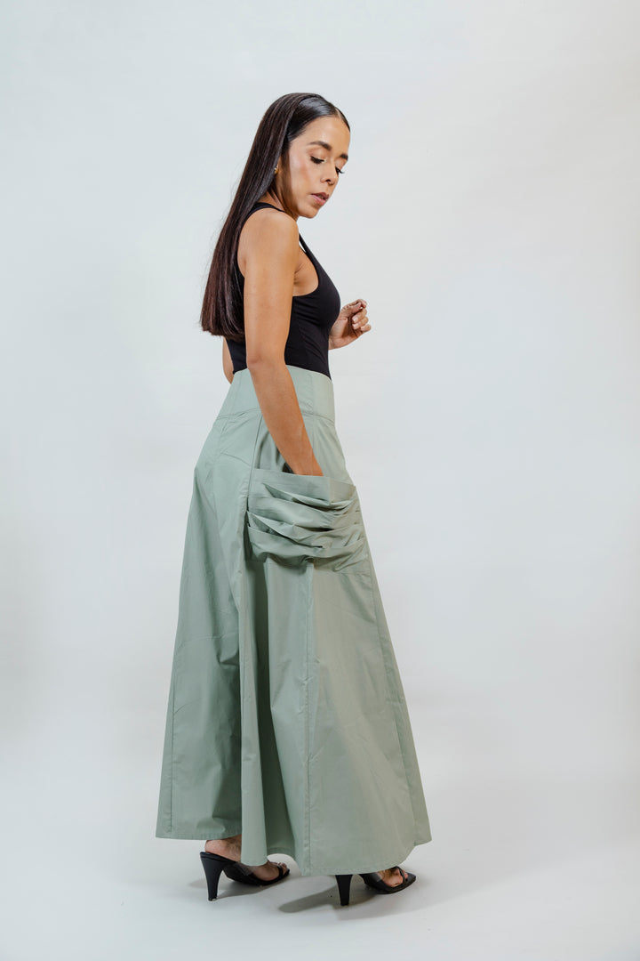 Una pieza contemporánea con silueta estructurada. Esta falda larga está elaborada en 100% algodón, lo que proporciona frescura, resistencia y comodidad. Su diseño destaca por los pliegues laterales tipo origami, que aportan volumen y originalidad, además de bolsillos funcionales. La cintura alta estiliza la figura y su largo hasta los tobillos la hace ideal para un look elegante o casual.