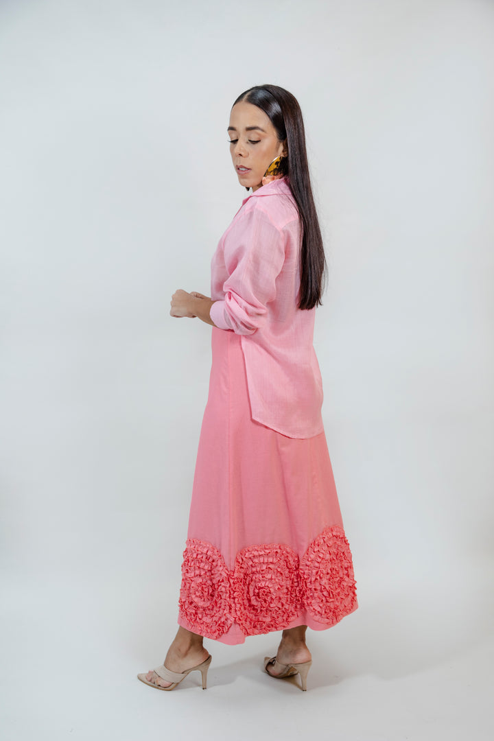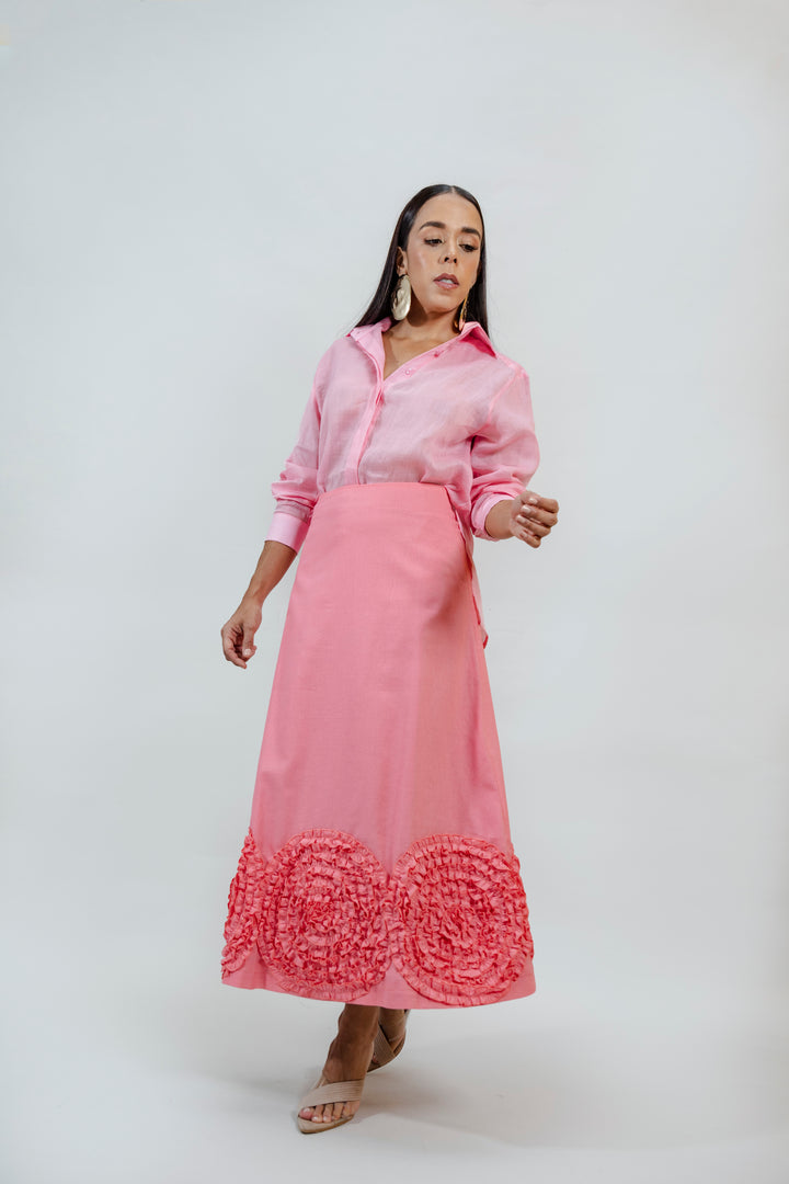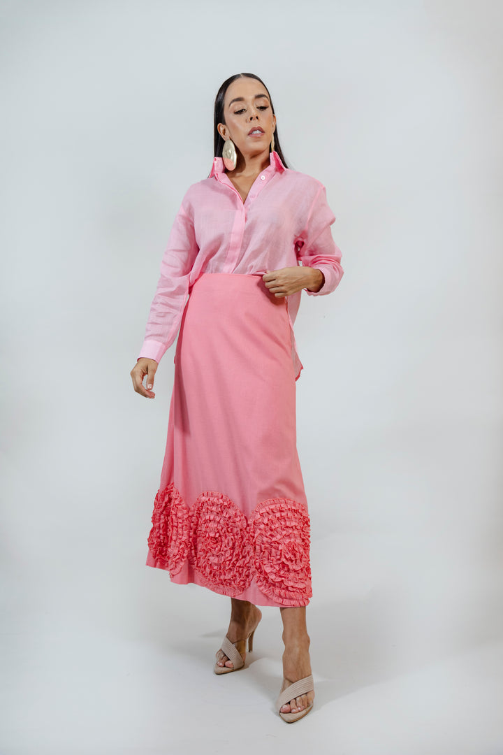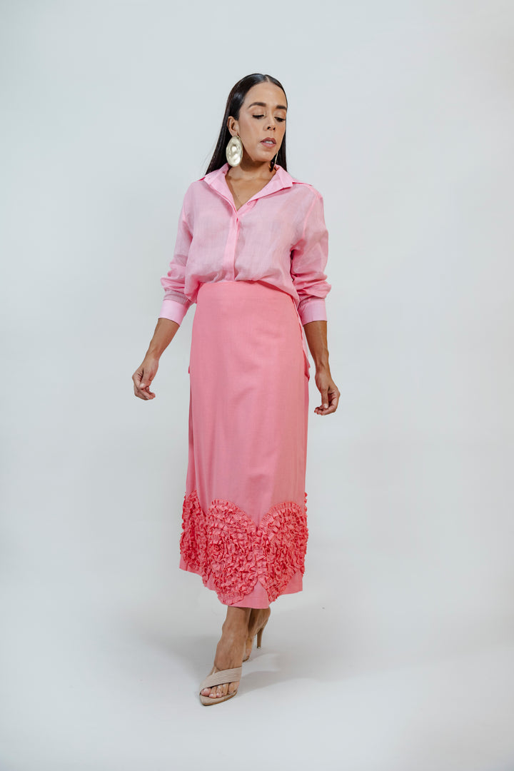 La falda es de corte recto, largo midi, y presenta un detalle decorativo en la parte inferior: apliques en forma de círculos en relieve, elaborados con la misma tela, que aportan un toque artesanal y elegante. La falda está confeccionada en una mezcla de 55% rayón viscosa y 45% algodón, lo que le aporta una textura suave, fluida y ligera, ideal para climas cálidos. El forro interior garantiza mayor comodidad y evita transparencias, haciendo de esta prenda una opción versátil y sofisticada tanto para eventos diurnos como para ocasiones más formales.