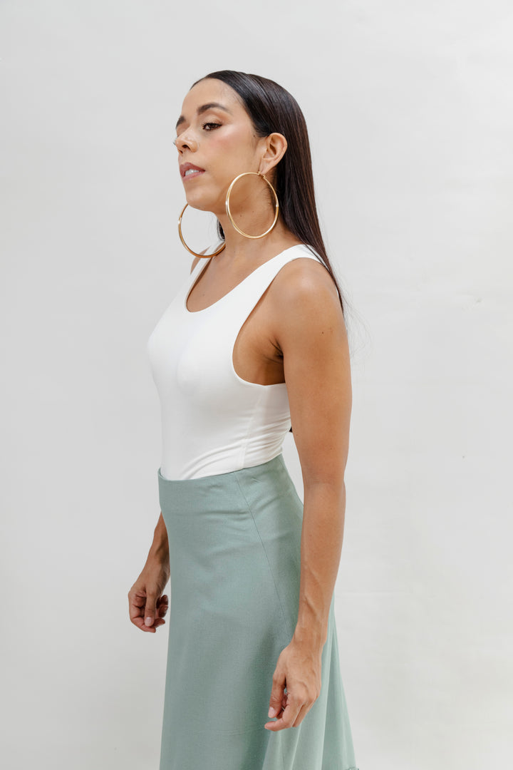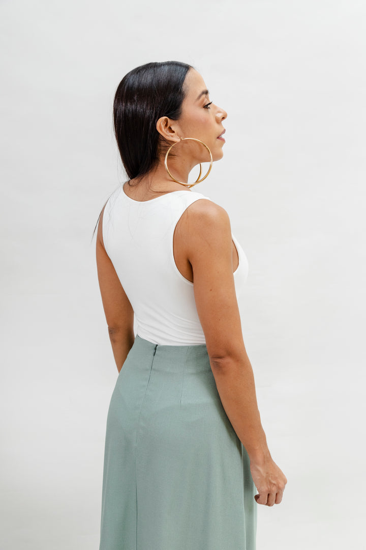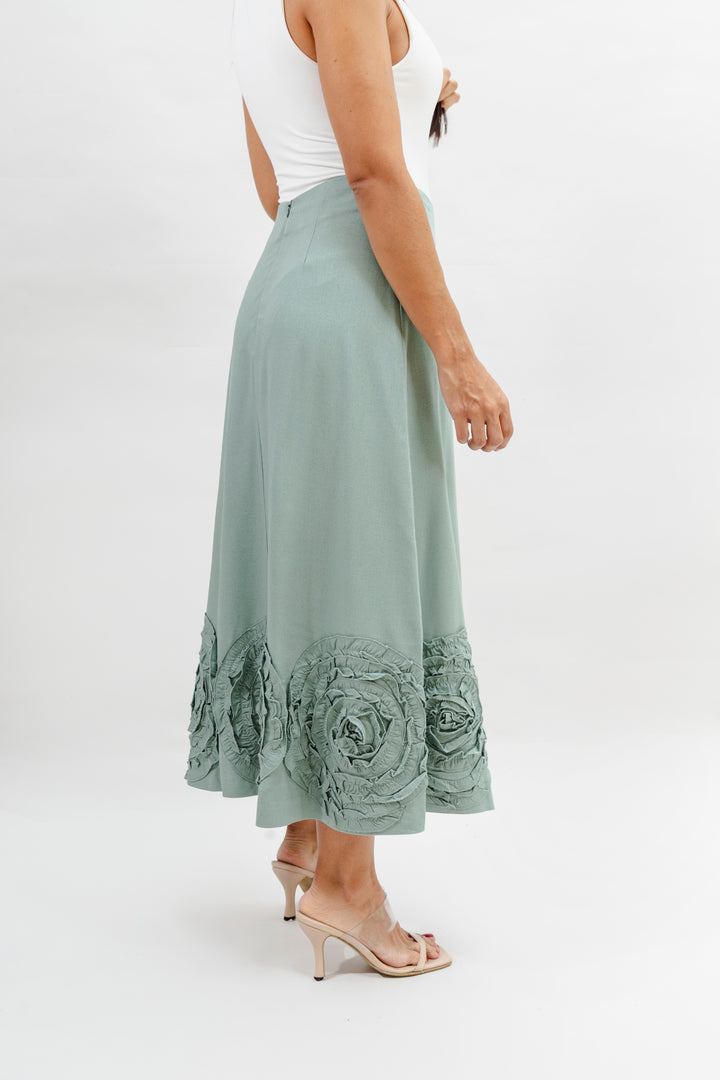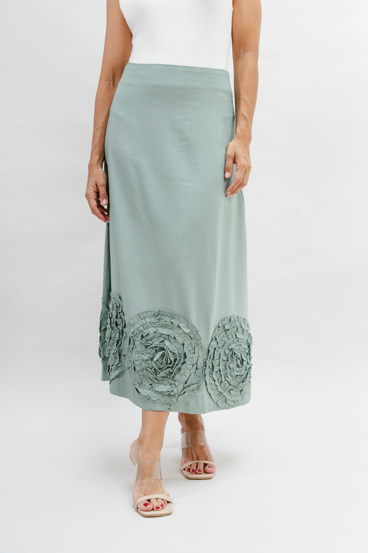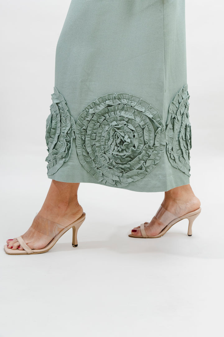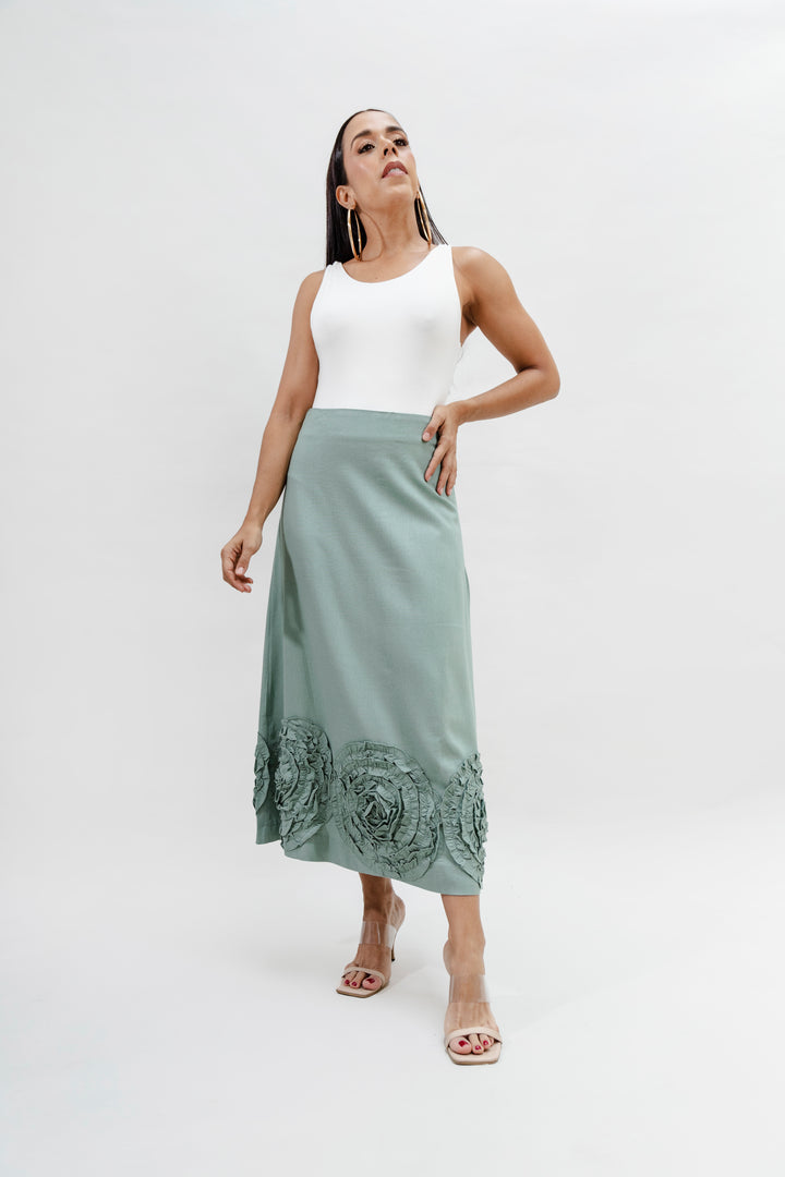 La falda es de corte recto, largo midi, y presenta un detalle decorativo en la parte inferior: apliques en forma de círculos en relieve, elaborados con la misma tela, que aportan un toque artesanal y elegante. La falda está confeccionada en una mezcla de 55% rayón viscosa y 45% algodón, lo que le aporta una textura suave, fluida y ligera, ideal para climas cálidos. El forro interior garantiza mayor comodidad y evita transparencias, haciendo de esta prenda una opción versátil y sofisticada tanto para eventos diurnos como para ocasiones más formales.