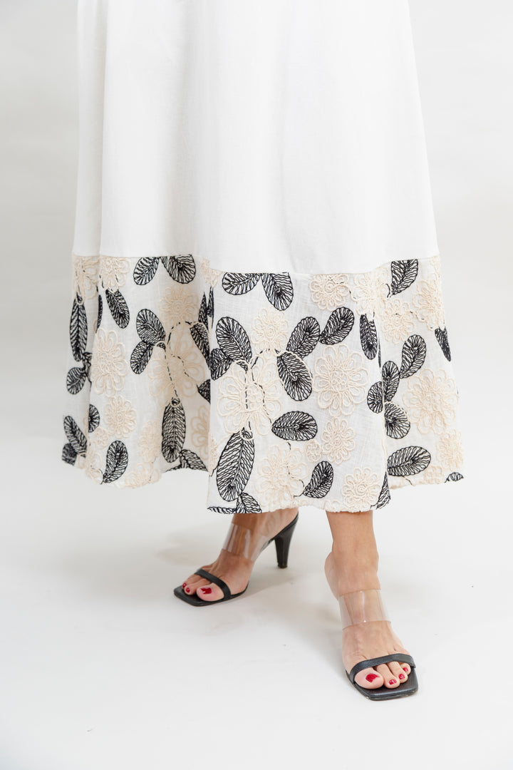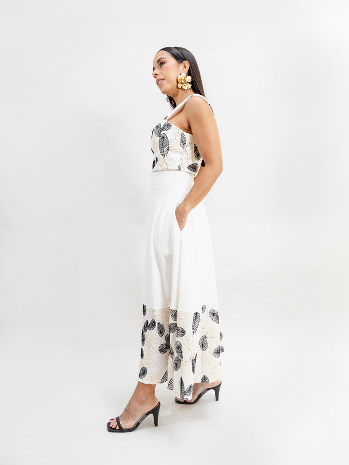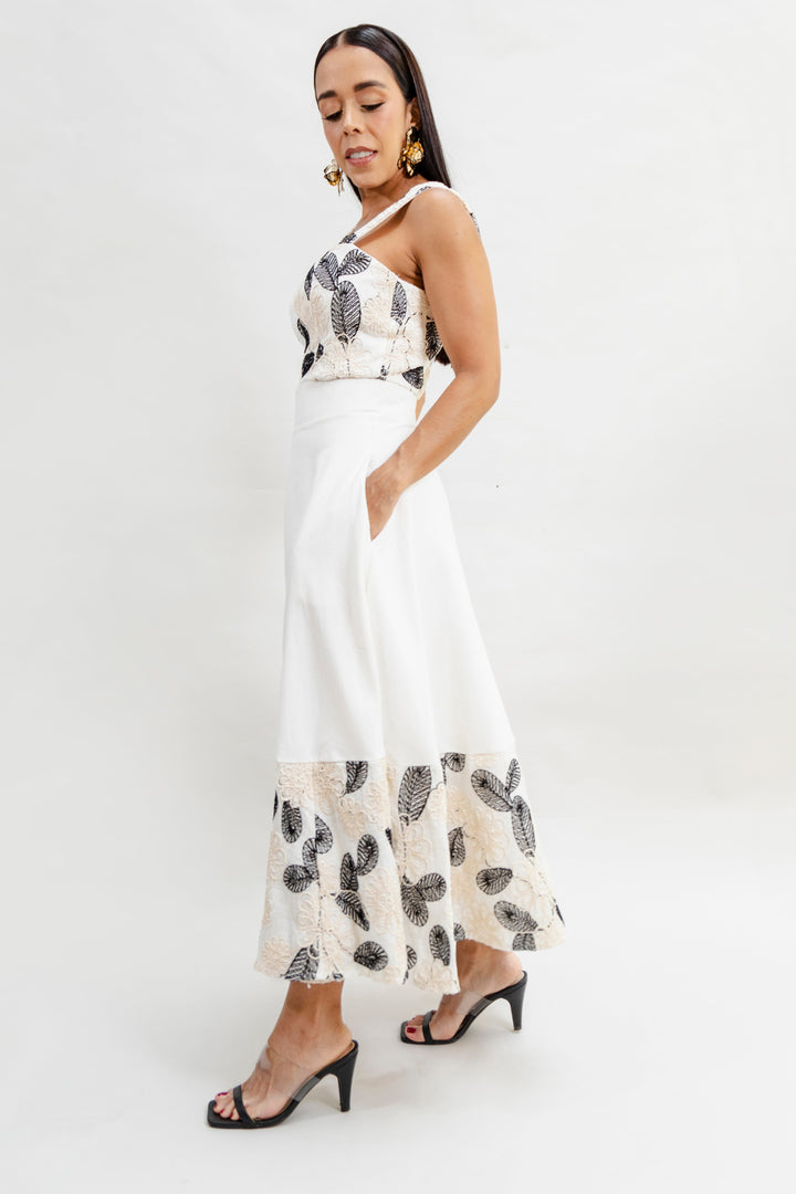 Diseñada para resaltar tu feminidad con un estilo sofisticado y fresco. Su silueta amplia y ligera aporta movimiento y comodidad, mientras que los detalles bordados con hojas en contraste añaden un aire artesanal y exclusivo. Perfecta para eventos de día o de noche donde quieras lucir un look elegante y diferente.