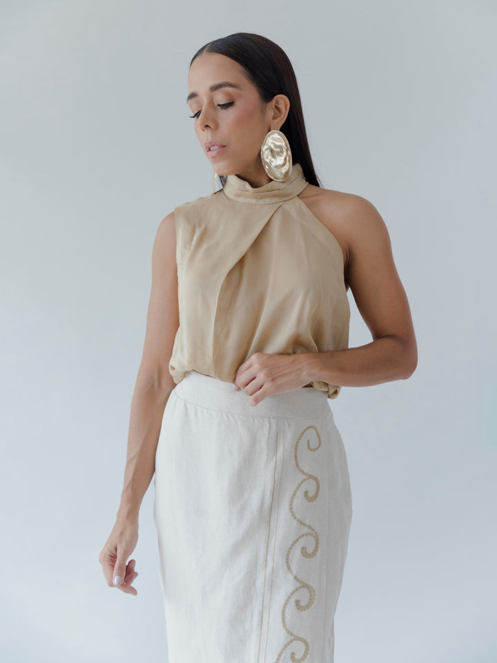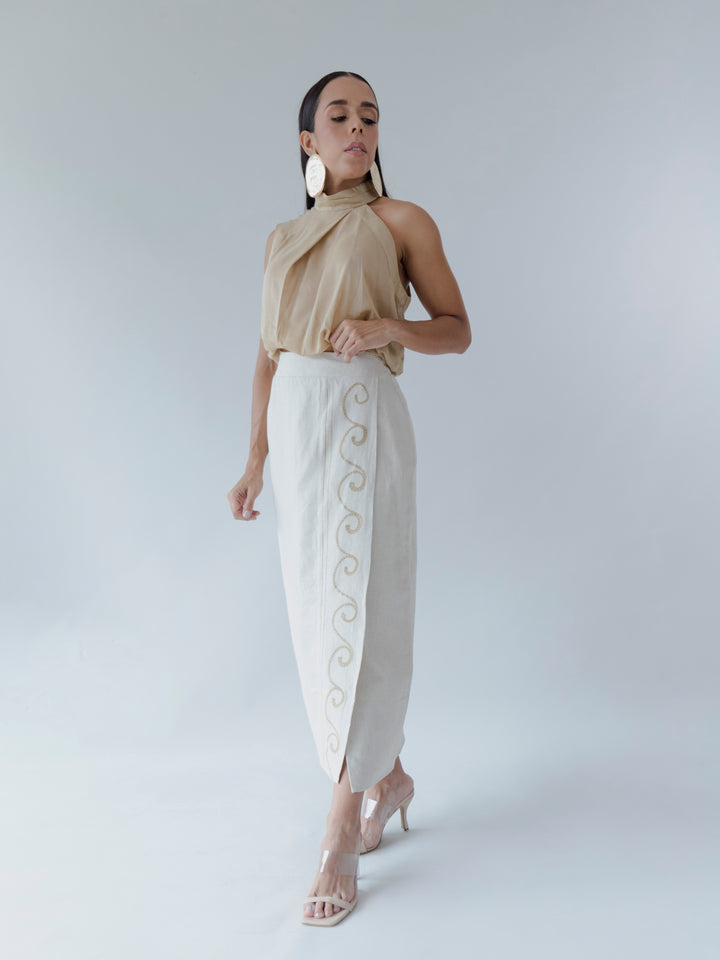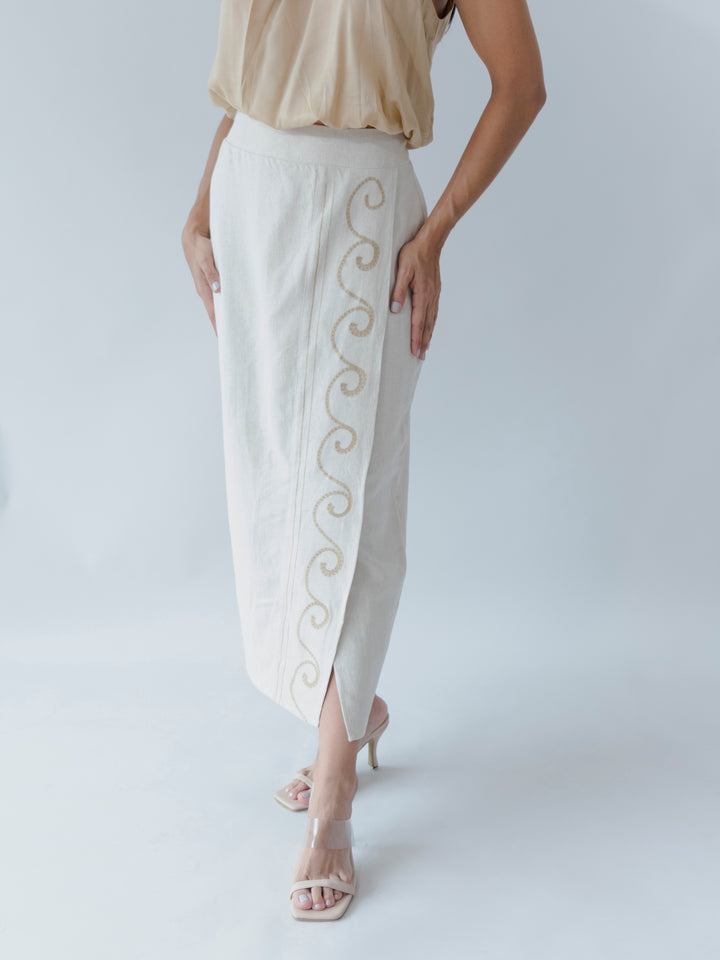 Falda de lino en tono natural, con bordado lateral en diseño ondulado que aporta un toque artesanal y elegante. Presenta un corte recto, abertura frontal discreta para mayor comodidad y un ajuste a la cintura que estiliza la silueta. Ideal para looks sofisticados y frescos.