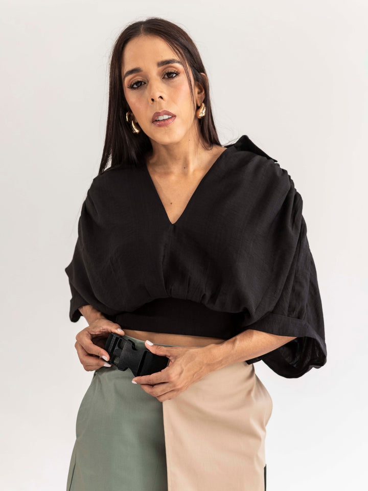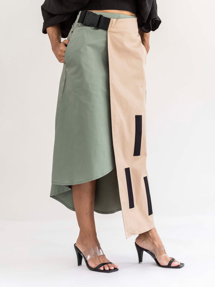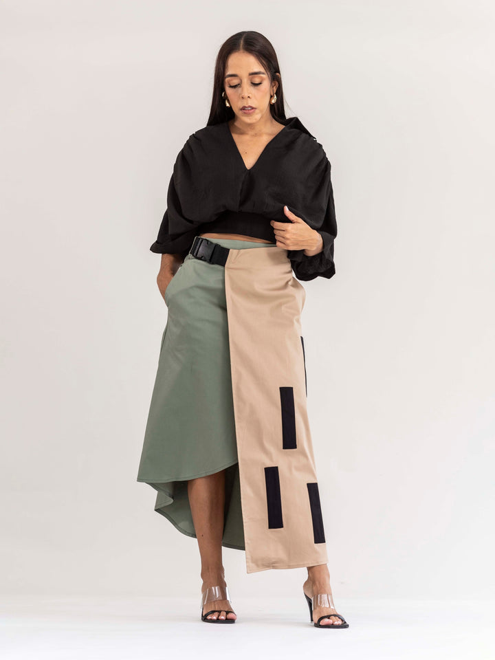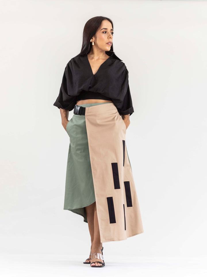 Falda midi asimétrica elaborada en una mezcla de 96% algodón y 4% spandex, que ofrece estructura, suavidad y un sutil grado de elasticidad para mayor comodidad. Su diseño bicolor con contraste geométrico y cinturón decorativo crea una silueta moderna y versátil, ideal para looks casuales o más sofisticados.