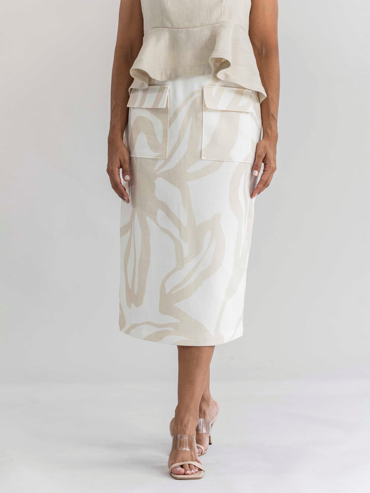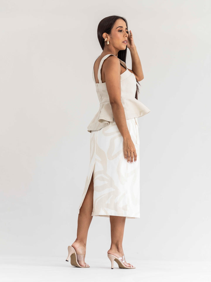 Una prenda que combina elegancia y naturalidad. Su silueta recta y abertura posterior realzan la figura con sutileza, mientras su estampado en tonos neutros aporta un aire fresco y sofisticado. Confeccionada en una mezcla de 85% algodón y 15% lino, brinda una textura suave, liviana y con la estructura perfecta para lucir impecable en cualquier ocasión.