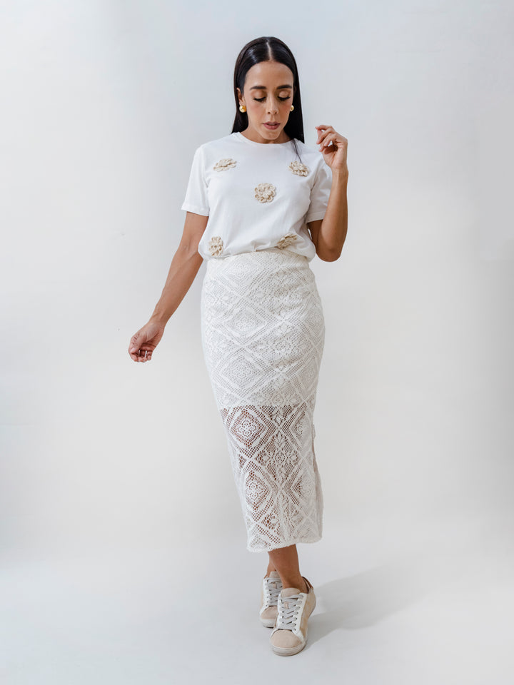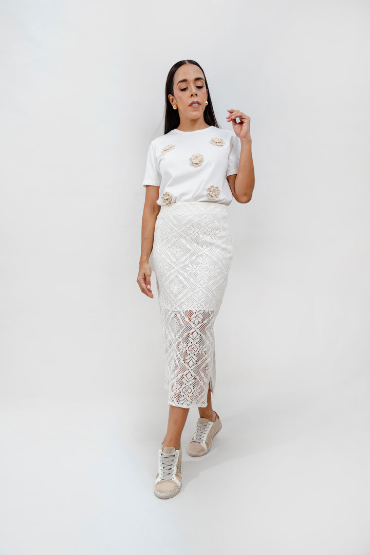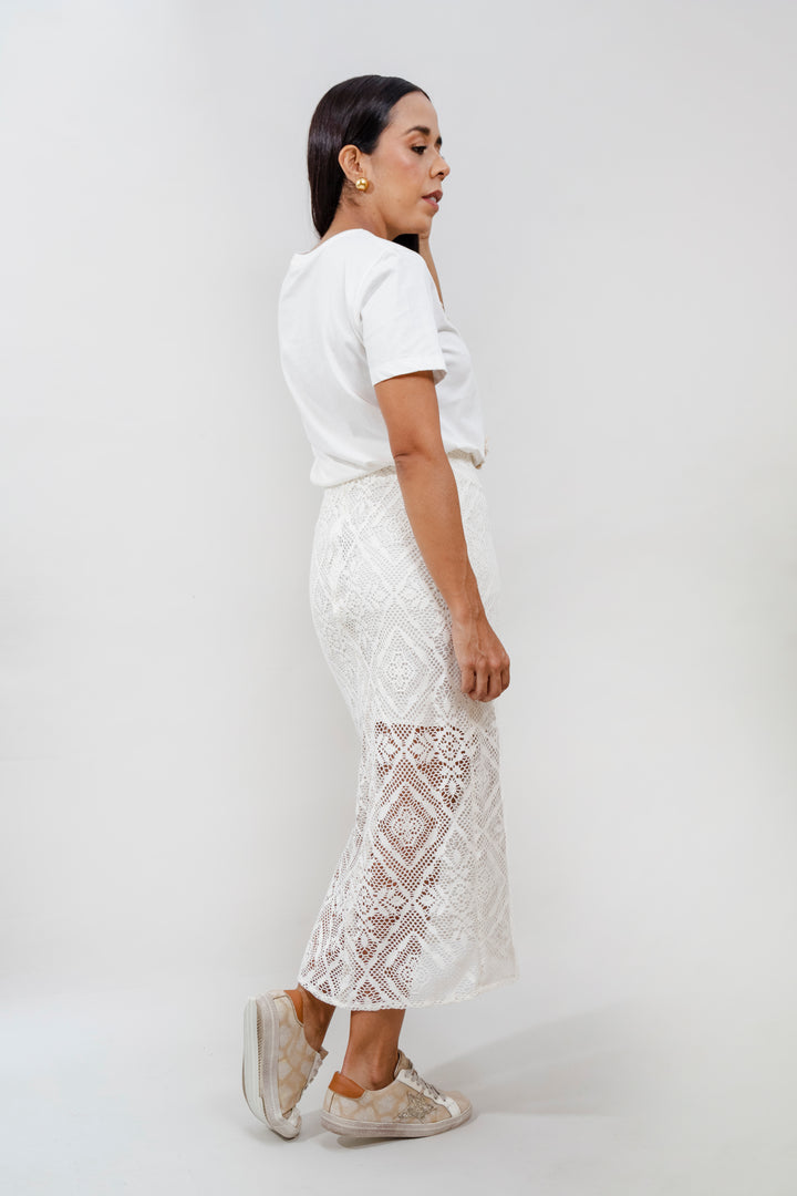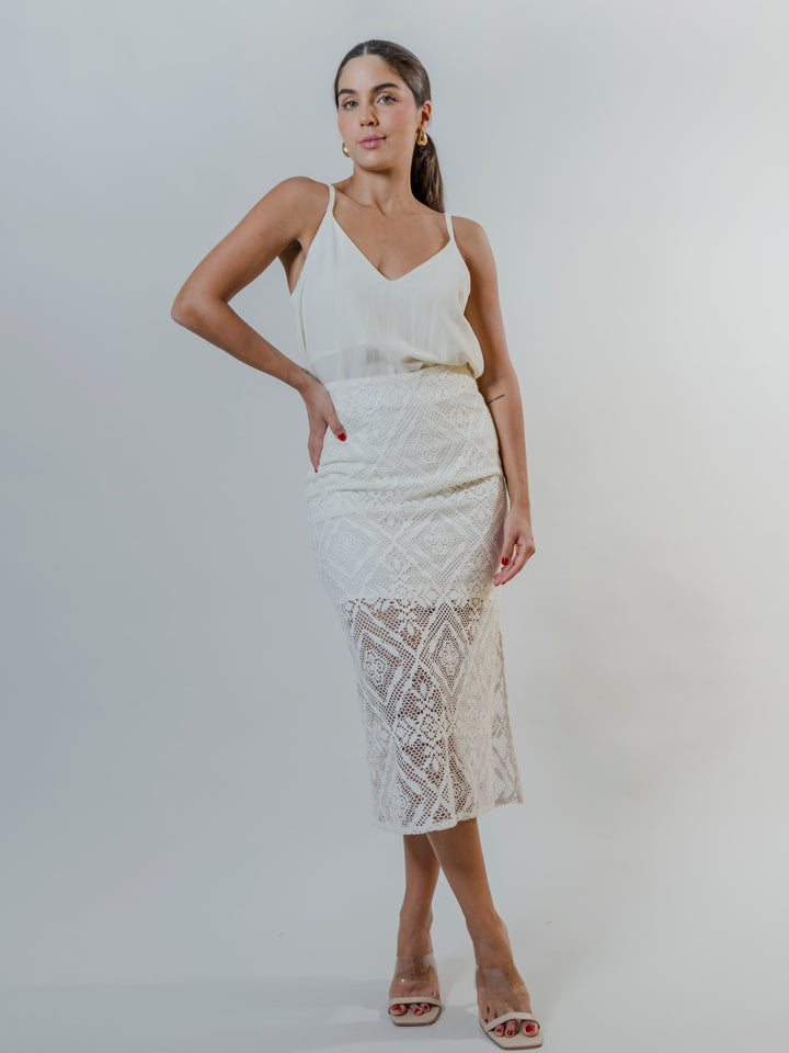 Una pieza que redefine la feminidad con elegancia. Esta falda midi de cintura alta combina estructura y suavidad en un delicado tejido de encaje. Su corte recto estiliza la silueta, mientras que el sutil contraste entre el forro superior y la transparencia inferior añade un toque de sofisticación y modernidad.
