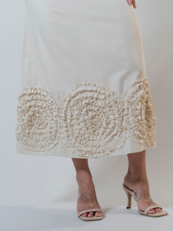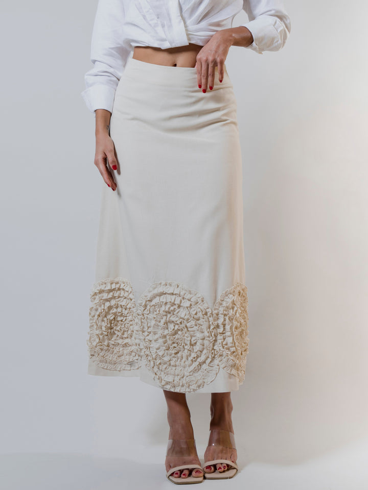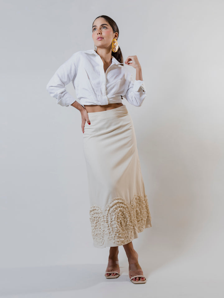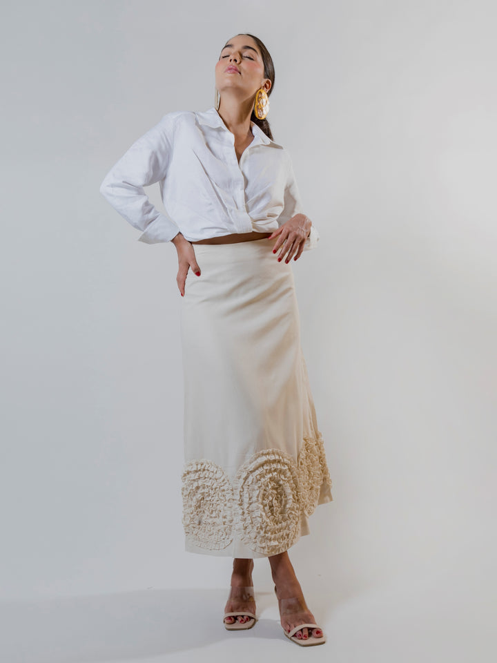 La falda es de corte recto, largo midi, y presenta un detalle decorativo en la parte inferior: apliques en forma de círculos en relieve, elaborados con la misma tela, que aportan un toque artesanal y elegante. La falda está confeccionada en una mezcla de 55% rayón viscosa y 45% algodón, lo que le aporta una textura suave, fluida y ligera, ideal para climas cálidos. El forro interior garantiza mayor comodidad y evita transparencias, haciendo de esta prenda una opción versátil y sofisticada tanto para eventos diurnos como para ocasiones más formales.