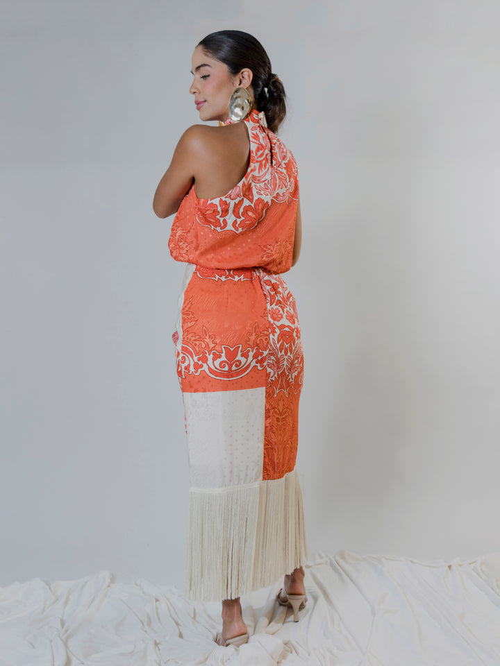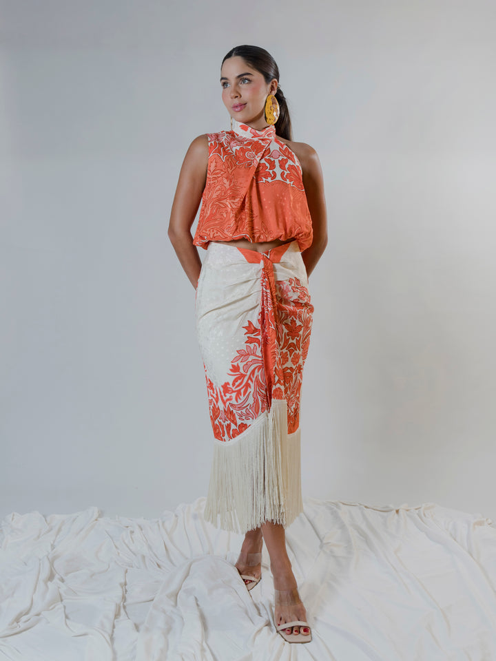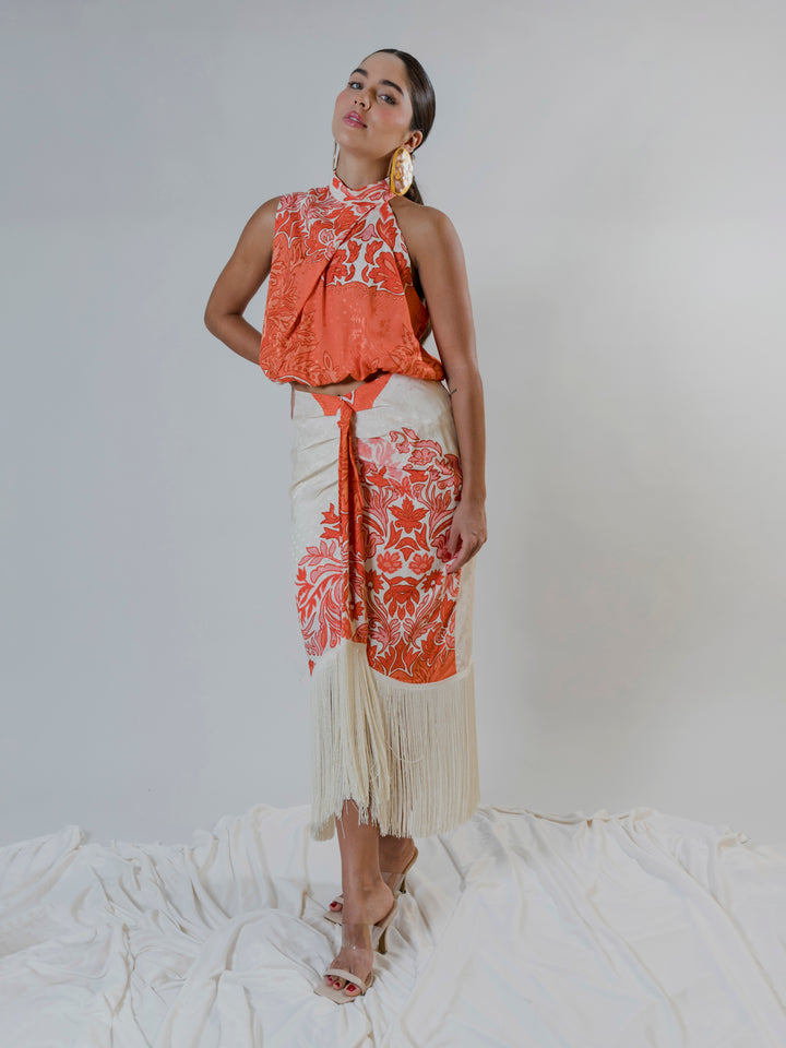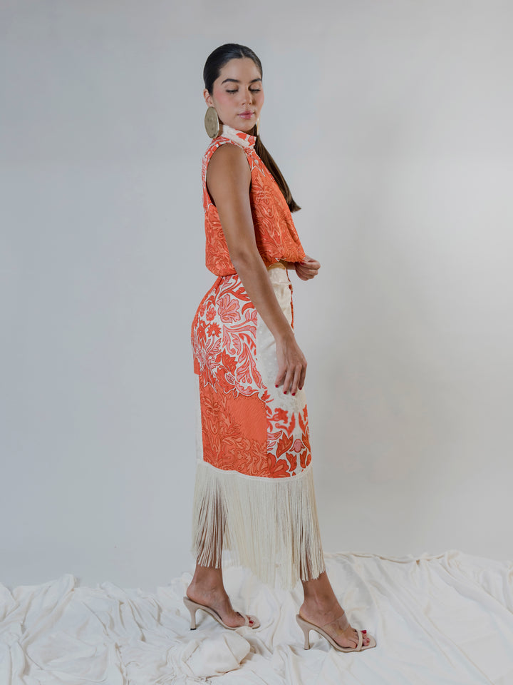 Una prenda que captura la esencia bohemia con un aire de sofisticación tropical. Confeccionada en 100% rayón viscosa y forro interior, esta falda ofrece una caída fluida, fresca y ligera. Su vibrante estampado coral con motivos botánicos aporta carácter y estilo, mientras que los flecos largos en el bajo añaden movimiento y un toque artesanal único.