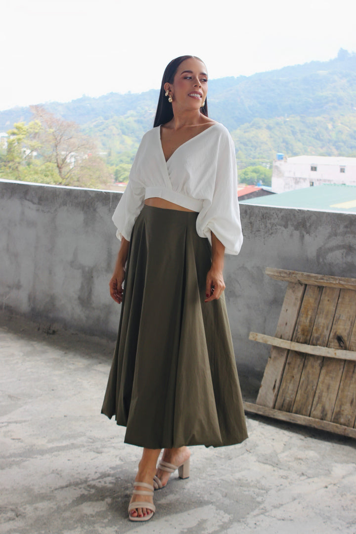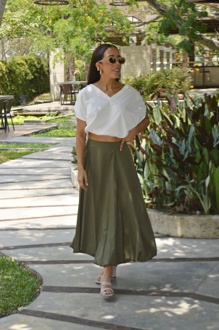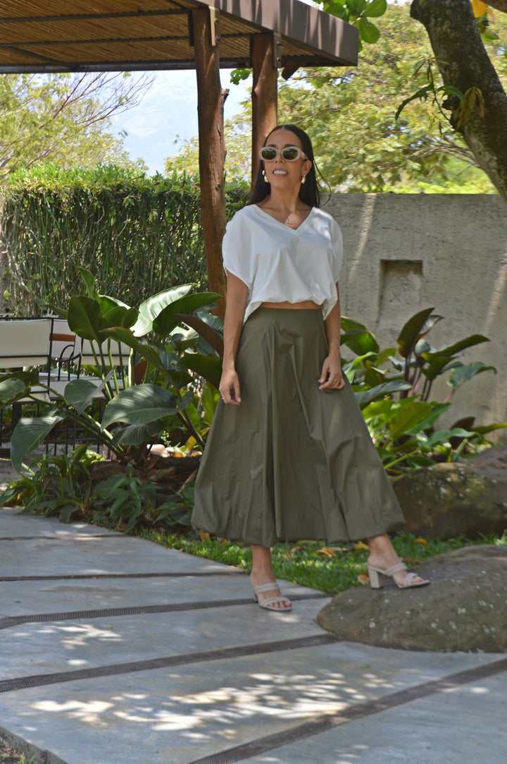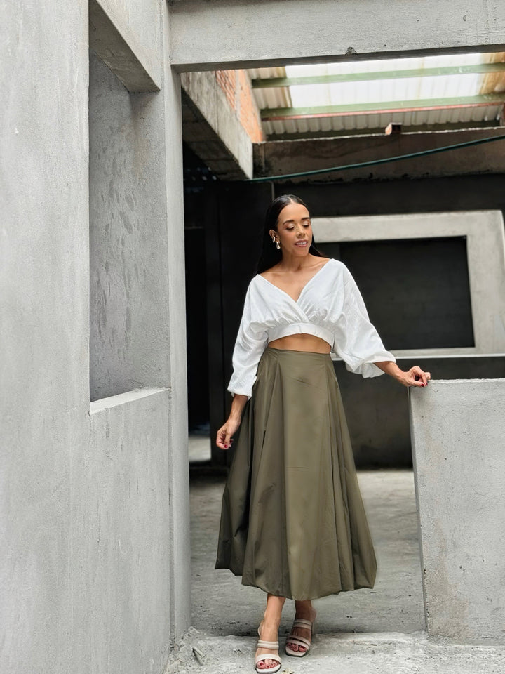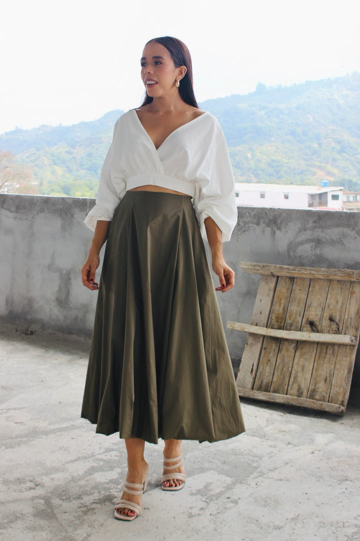 Falda larga tipo globo, confeccionada en algodón 100% para brindar frescura y comodidad. Su diseño asimétrico con volumen en la parte inferior aporta un toque sofisticado y moderno, ideal para destacar en cualquier ocasión. Versátil para looks formales o casuales.                                                                                                                                                Puedes combinarla con: