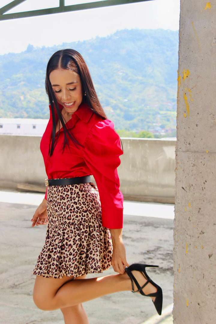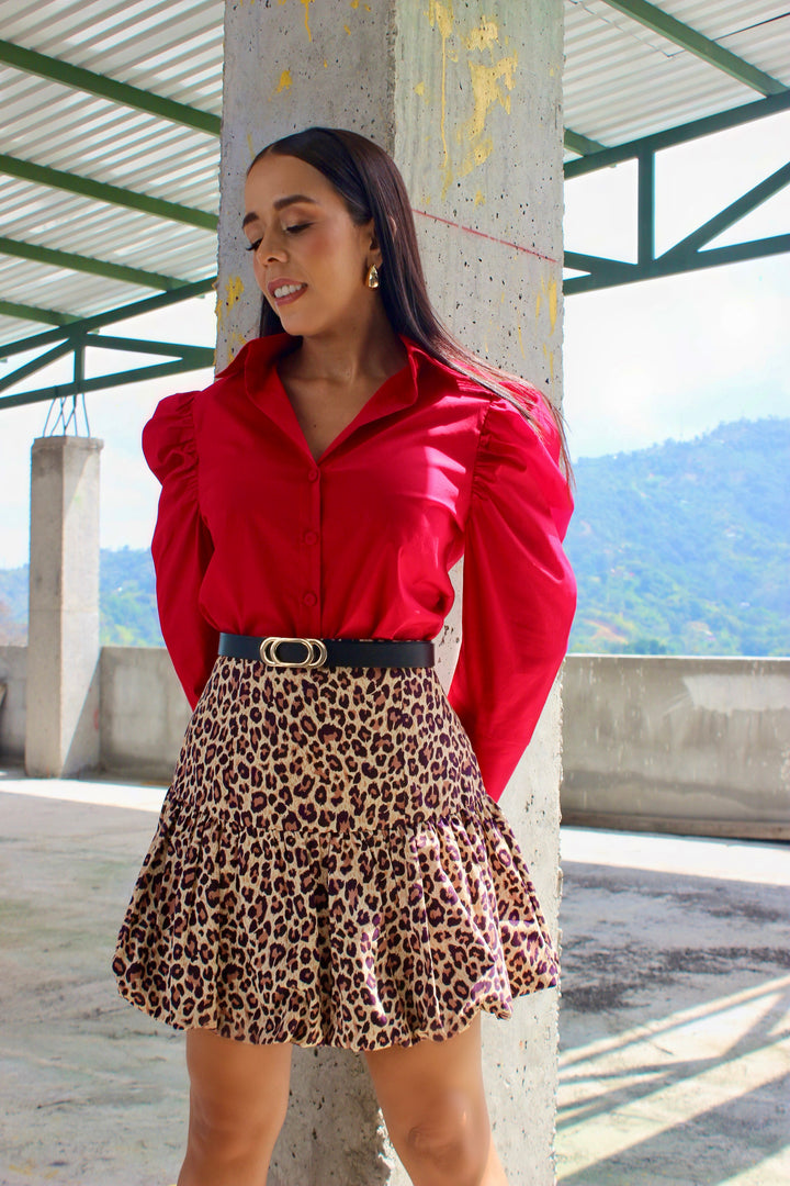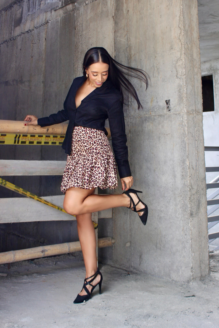 Falda corta con estampado animal print en tonos tierra, confeccionada en 100% algodón, que combina comodidad y estilo. Su diseño de doble vuelo crea un efecto voluminoso y femenino, ideal para un look audaz y sofisticado.